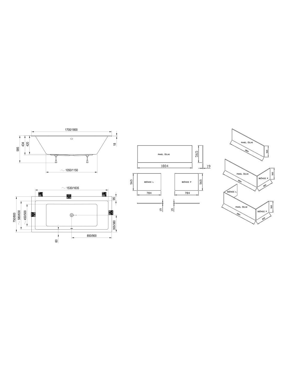 170 x 75 cm vonią, galima įsigyti su priekine ir šonine MDF baltos plokštės panele. Prie priekinės panelės, nereikia pirkti atskirai apdailos plokštės tvirtinimo komplekto!