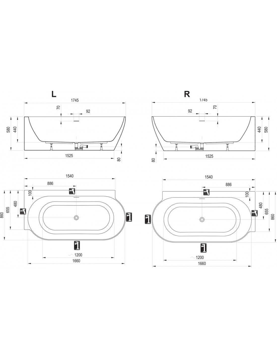 Vonios negalima papildyti vonios sienele. Vonios nutekėjimo komplektas ir atrama (kojos) yra komplekte.