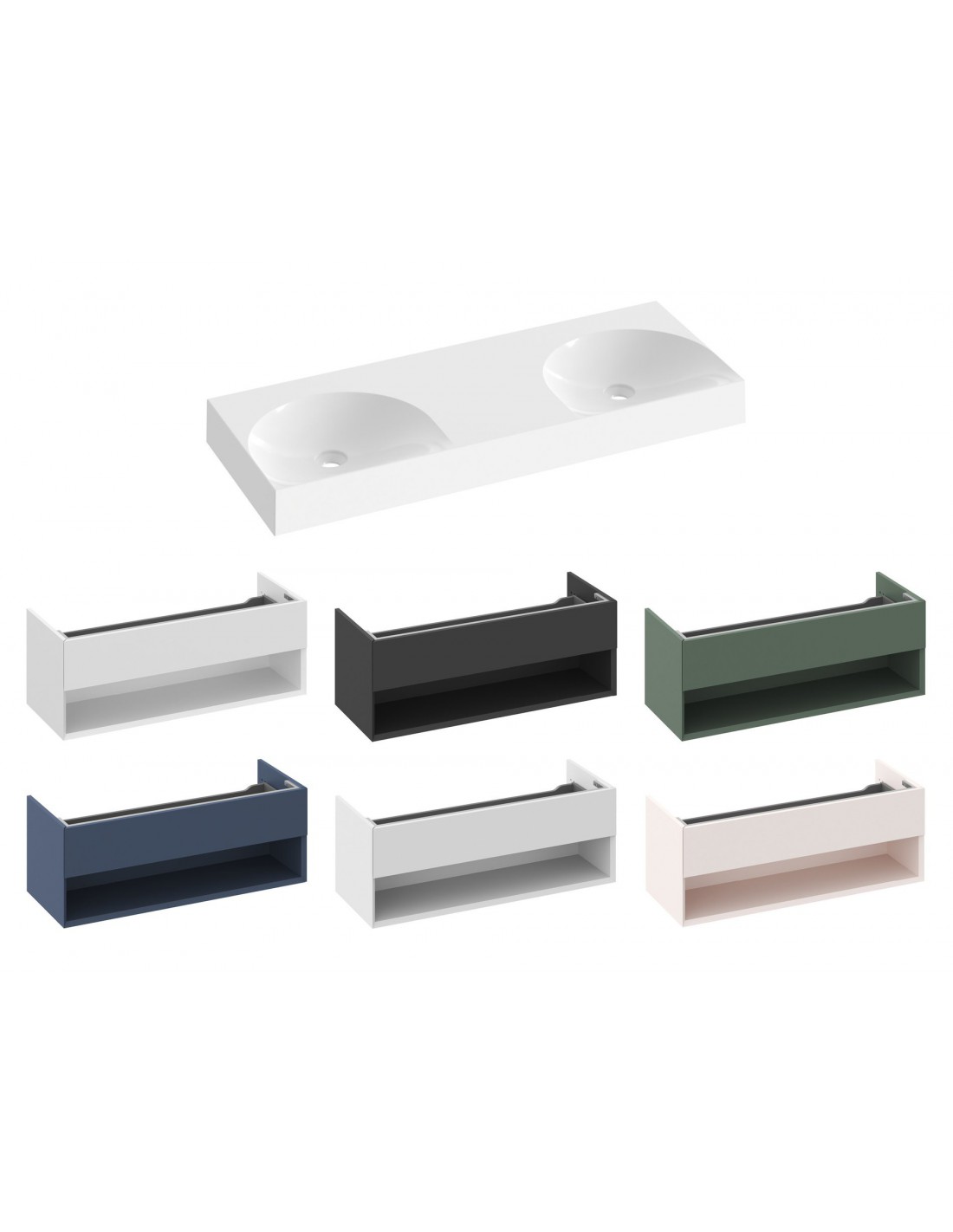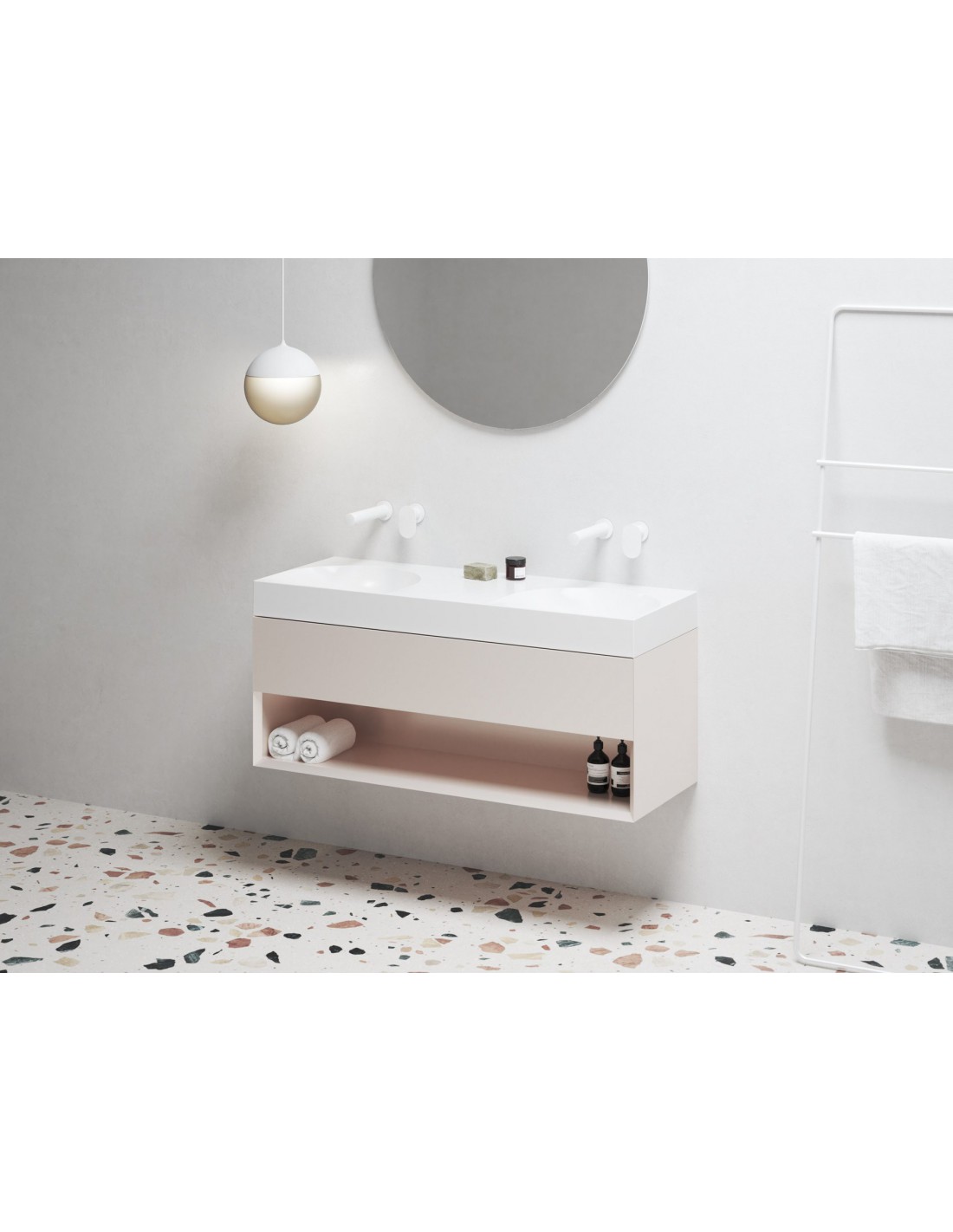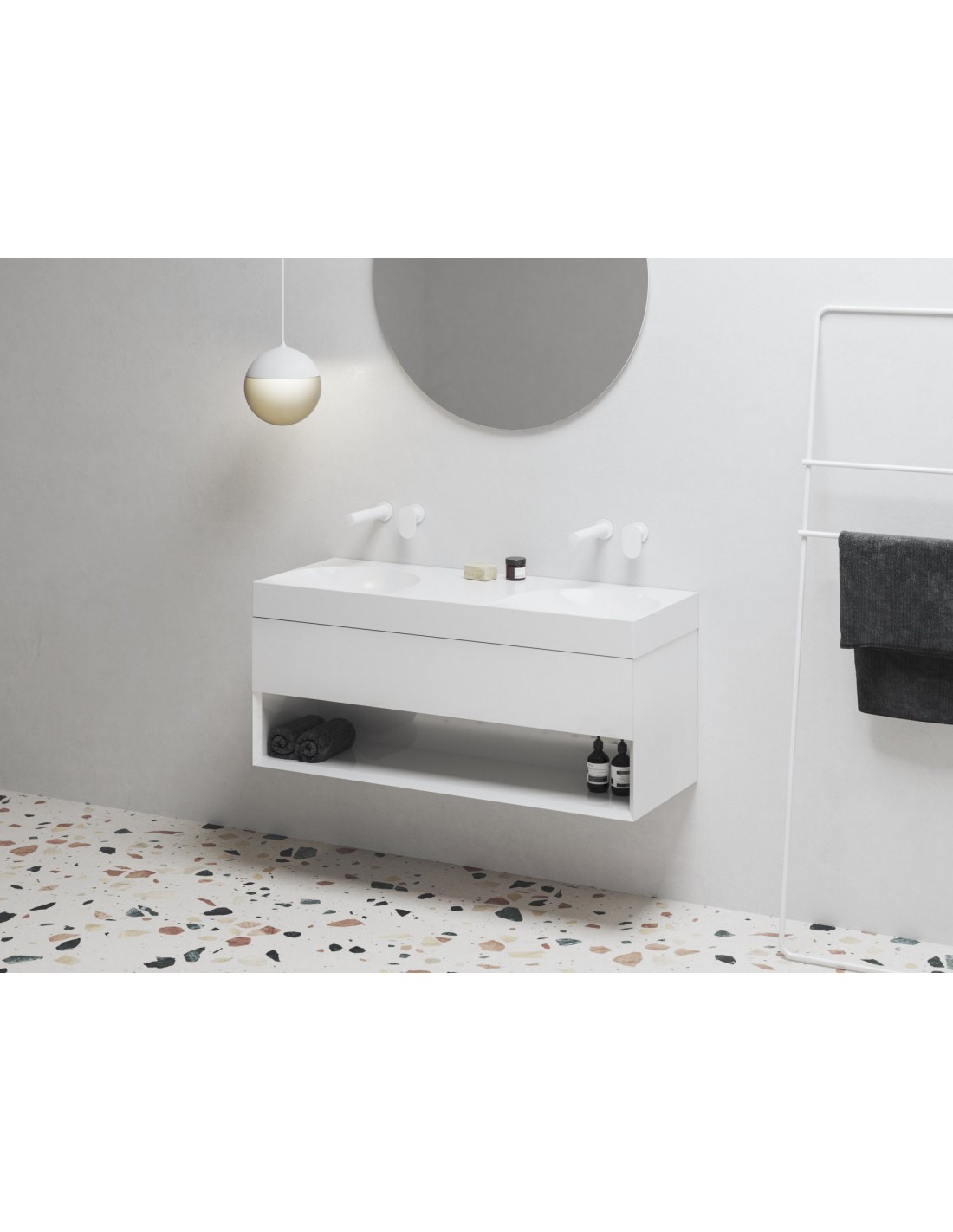 Baldinis dvigubas praustuvas iš marmuro Lite, skirtas montuoti ant sienos arba kartu su spintele, be perpildymo. Balta apdaila, be angos, todėl derinamas su potinkiniu maišytuvu.