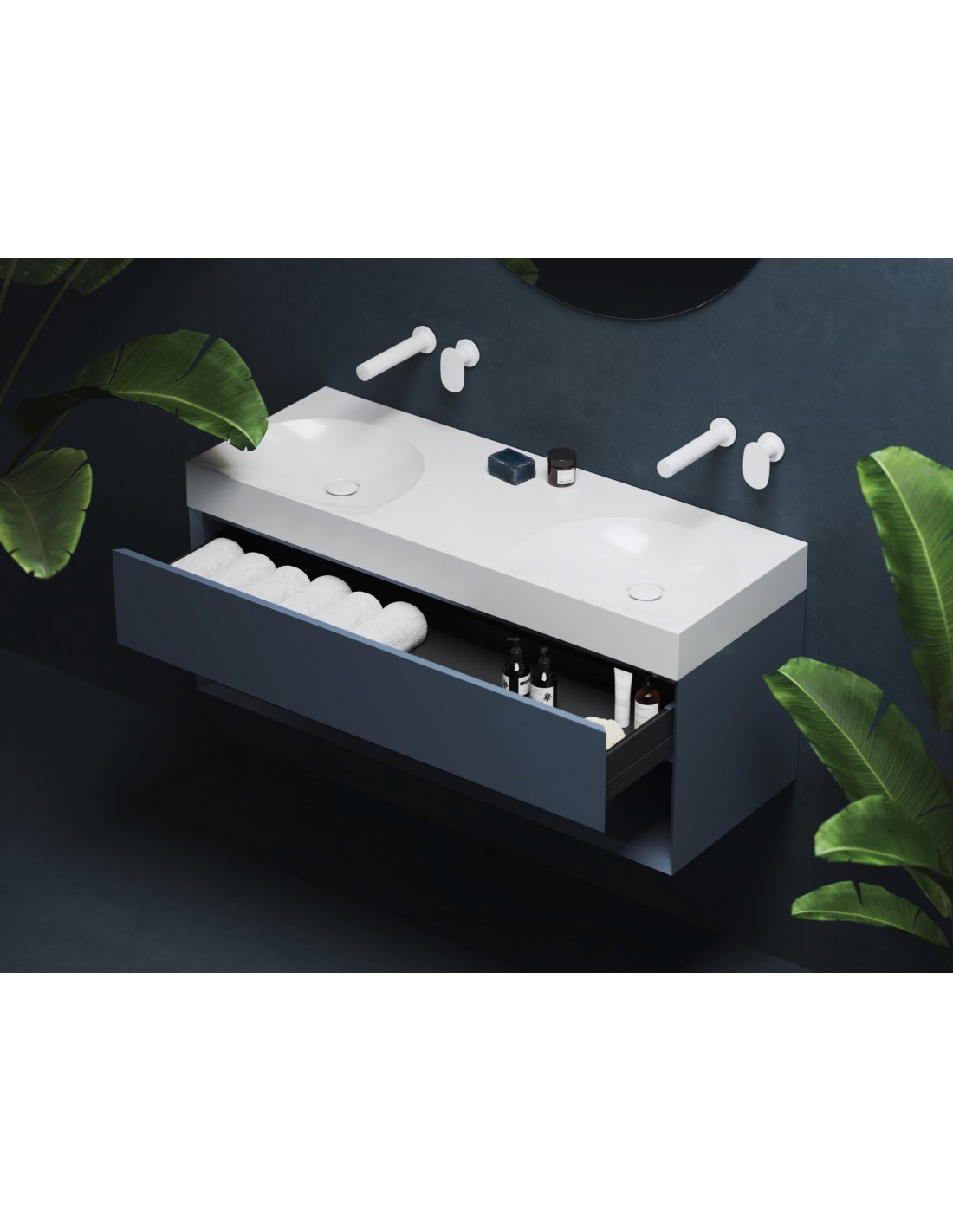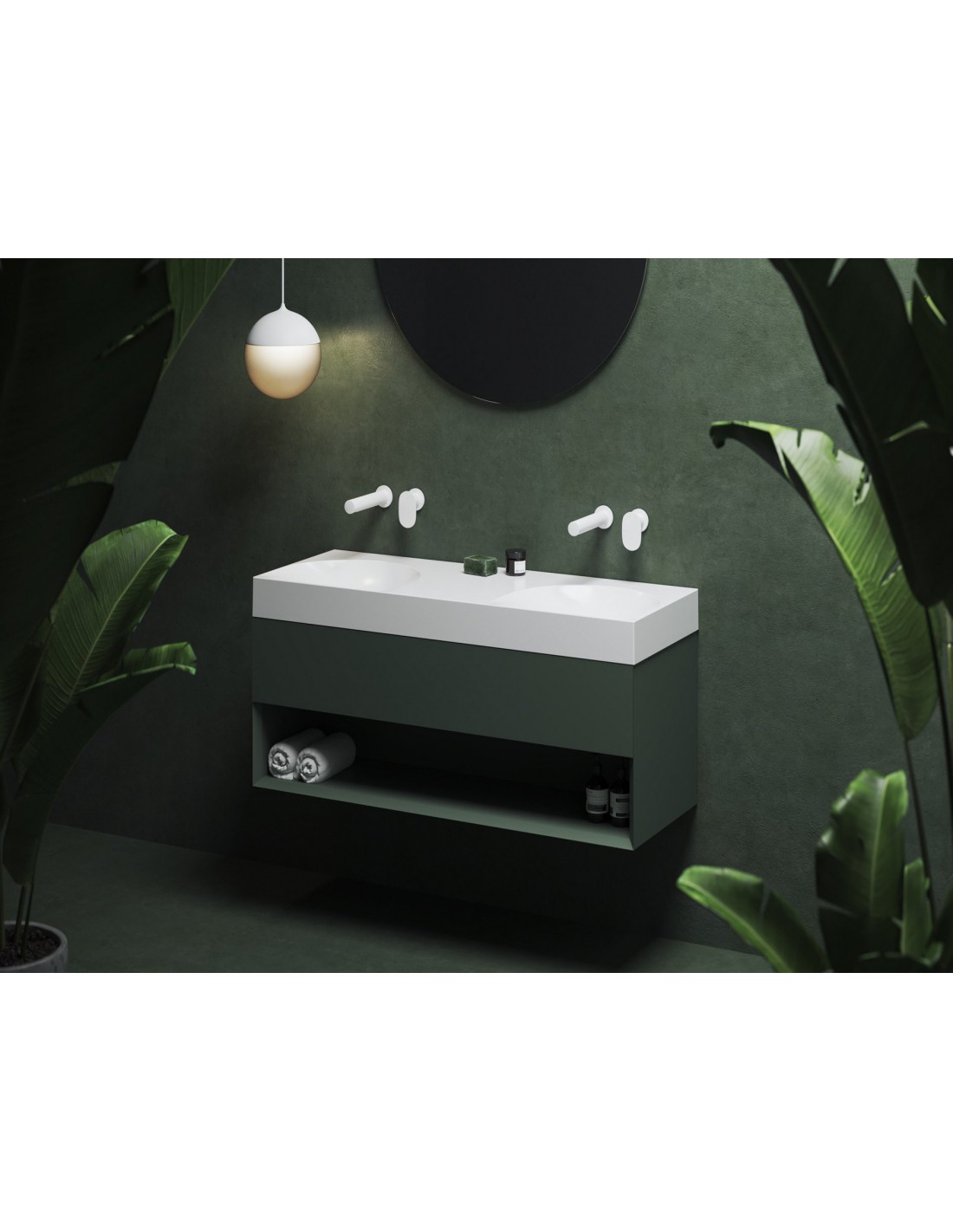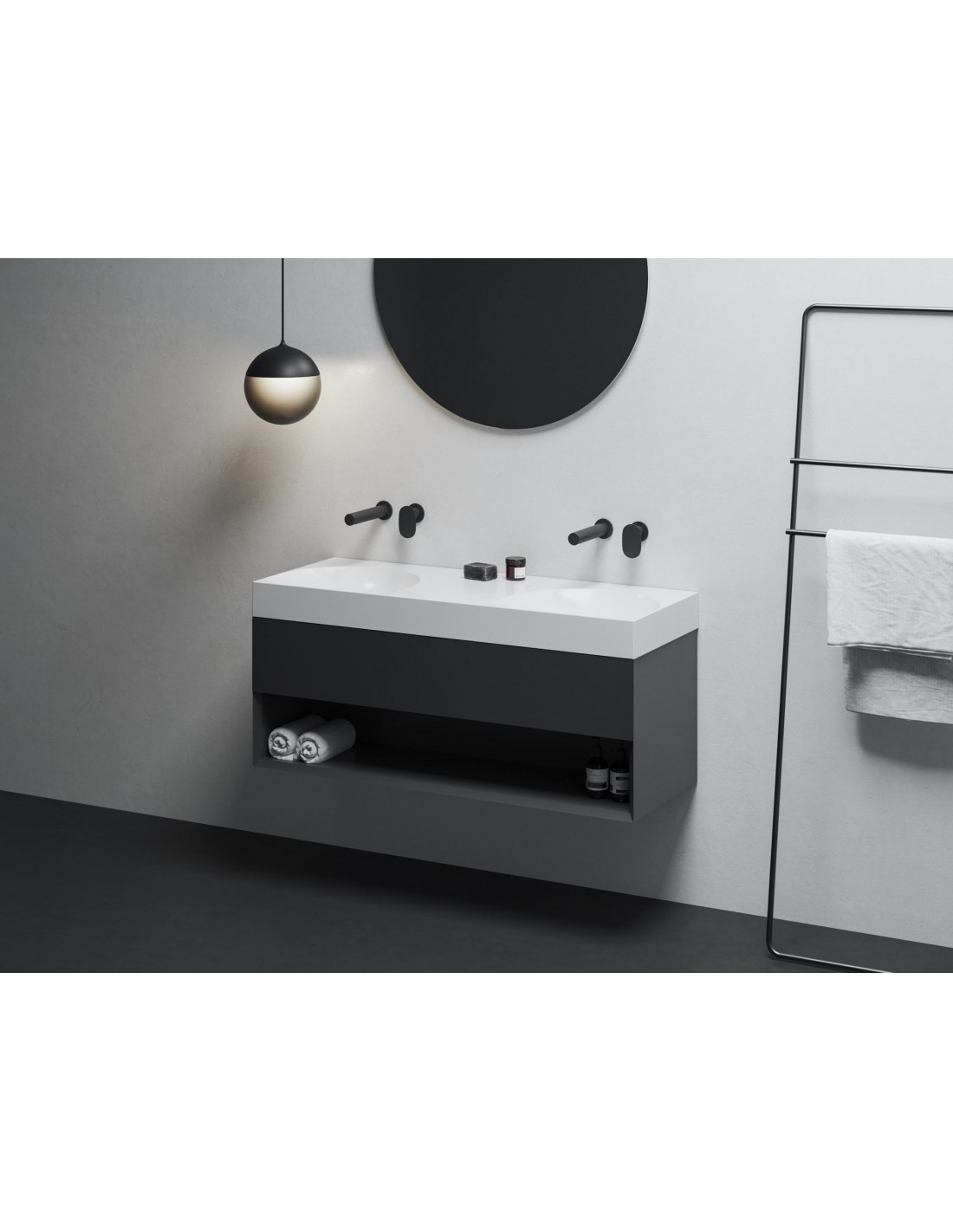 Baldinis dvigubas praustuvas iš marmuro Lite, skirtas montuoti ant sienos arba kartu su spintele, be perpildymo. Balta apdaila, be angos, todėl derinamas su potinkiniu maišytuvu.