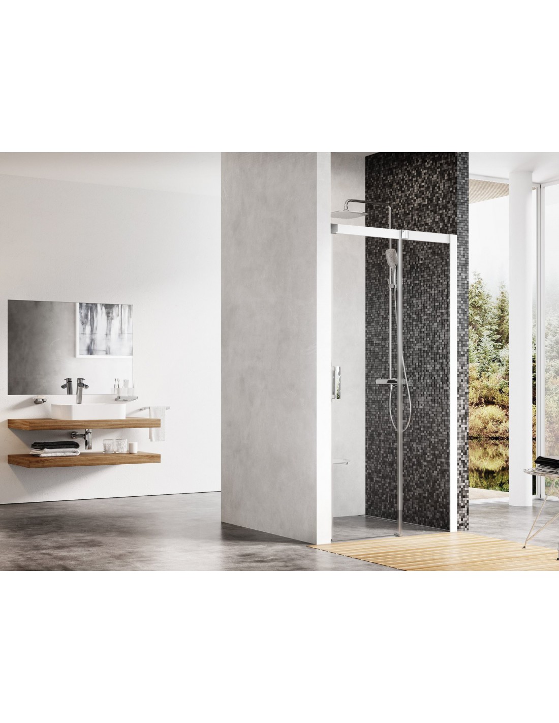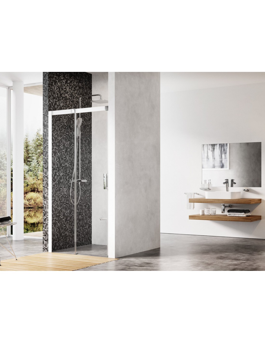 Gaminį sudaro dvi dalys, kurių viena yra slankiojančios durys. Kairinis arba dešininis gaminio variantas nustatomas pagal slankiojančių durų atidarymo kryptį, žiūrint iš lauko pusės. Montuojama plytelėmis išklotame vonios kambaryje tiesiai ant grindų su įmontuotu nutekamuoju lataku.