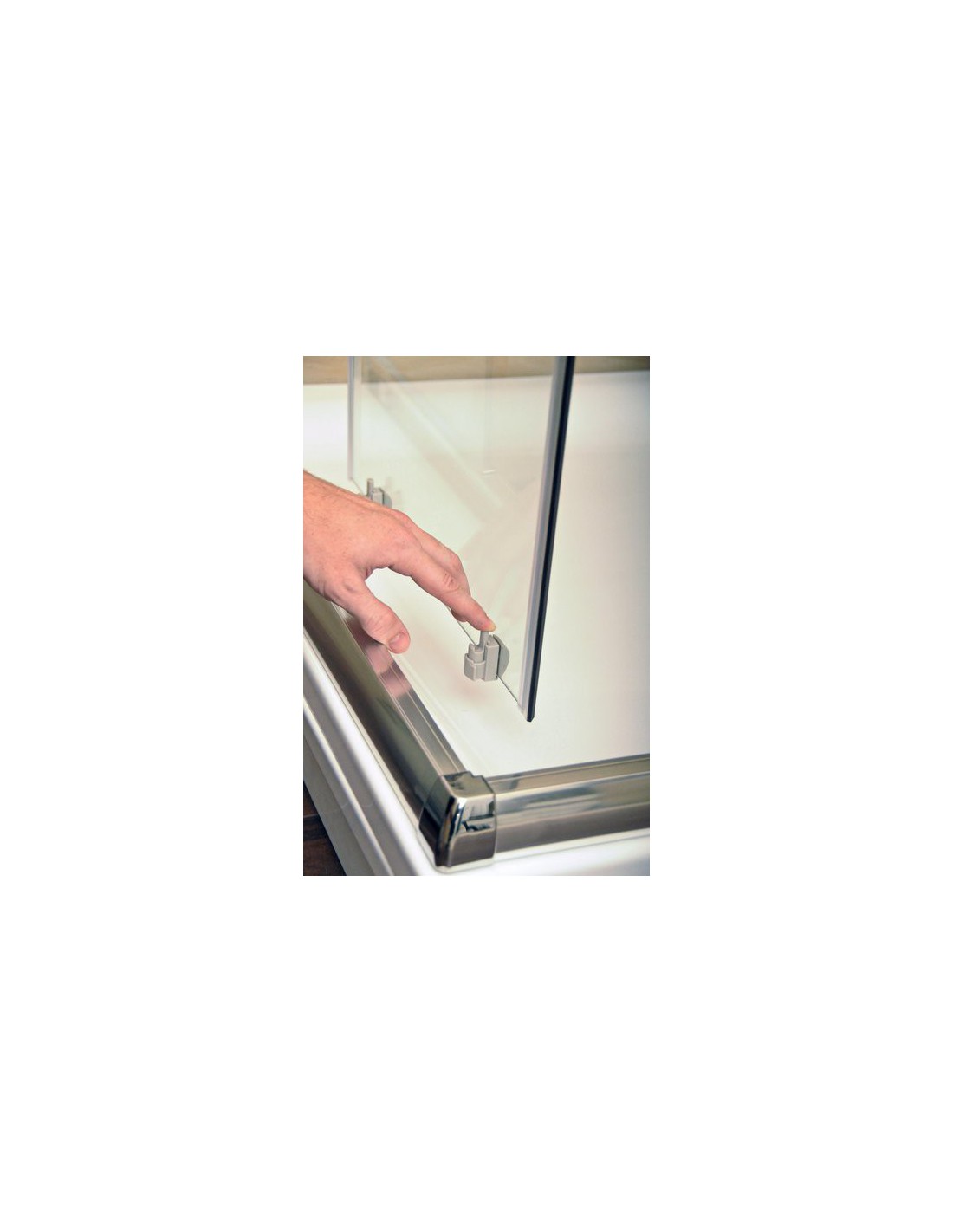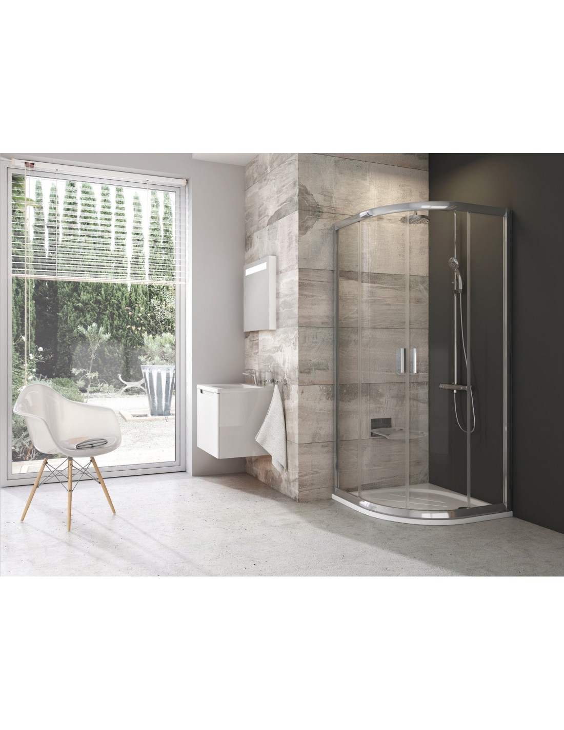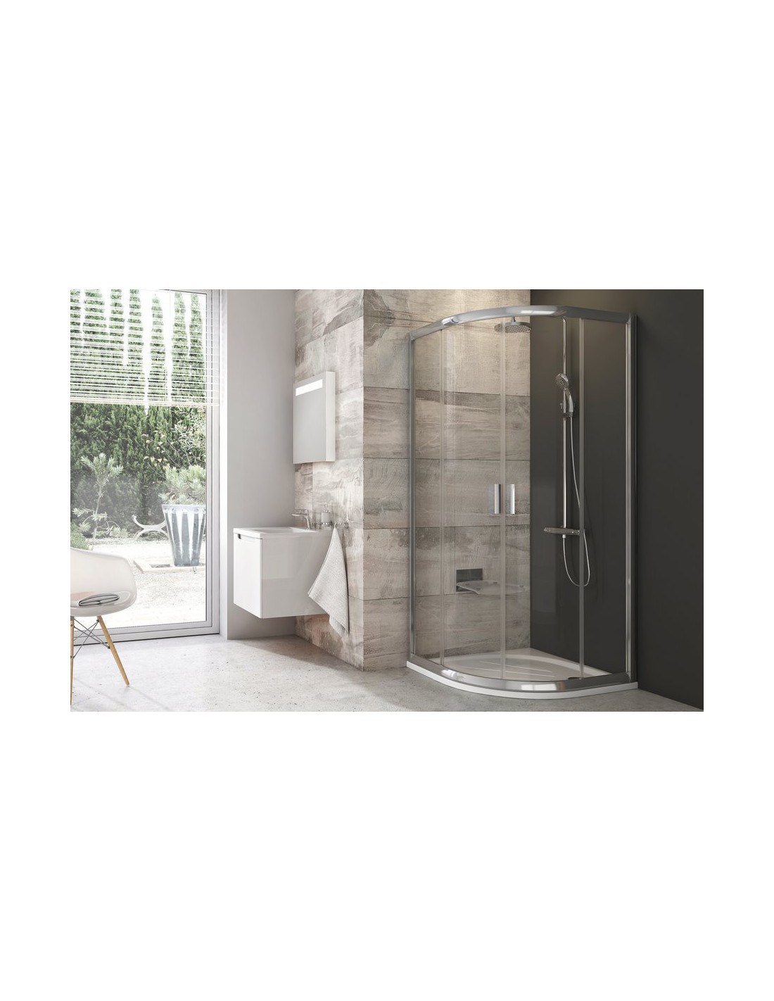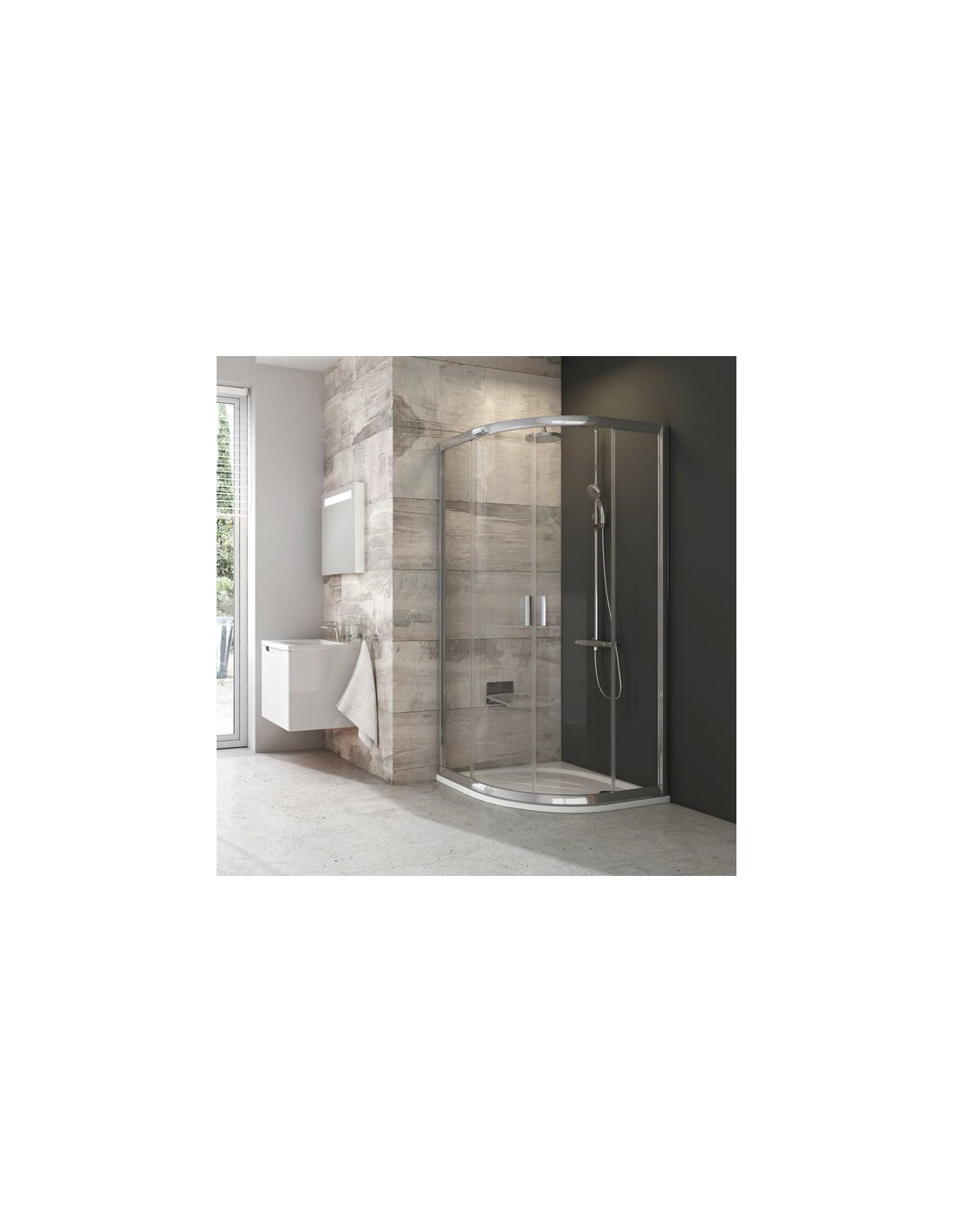 Gaminį sudaro dvi lygios nejudančios dalys ir dvi lenktos dalys - stumdomos durys. Įrengiama vonios kambario kampe, išklijuotame plytelėmis, ant padėklų RAVAK ELIPSO PRO FLAT R550 arba tiesiog ant grindų su įrengtu dušo kanalu arba trapu. Galima pagaminti netipišką dušo kabiną.
