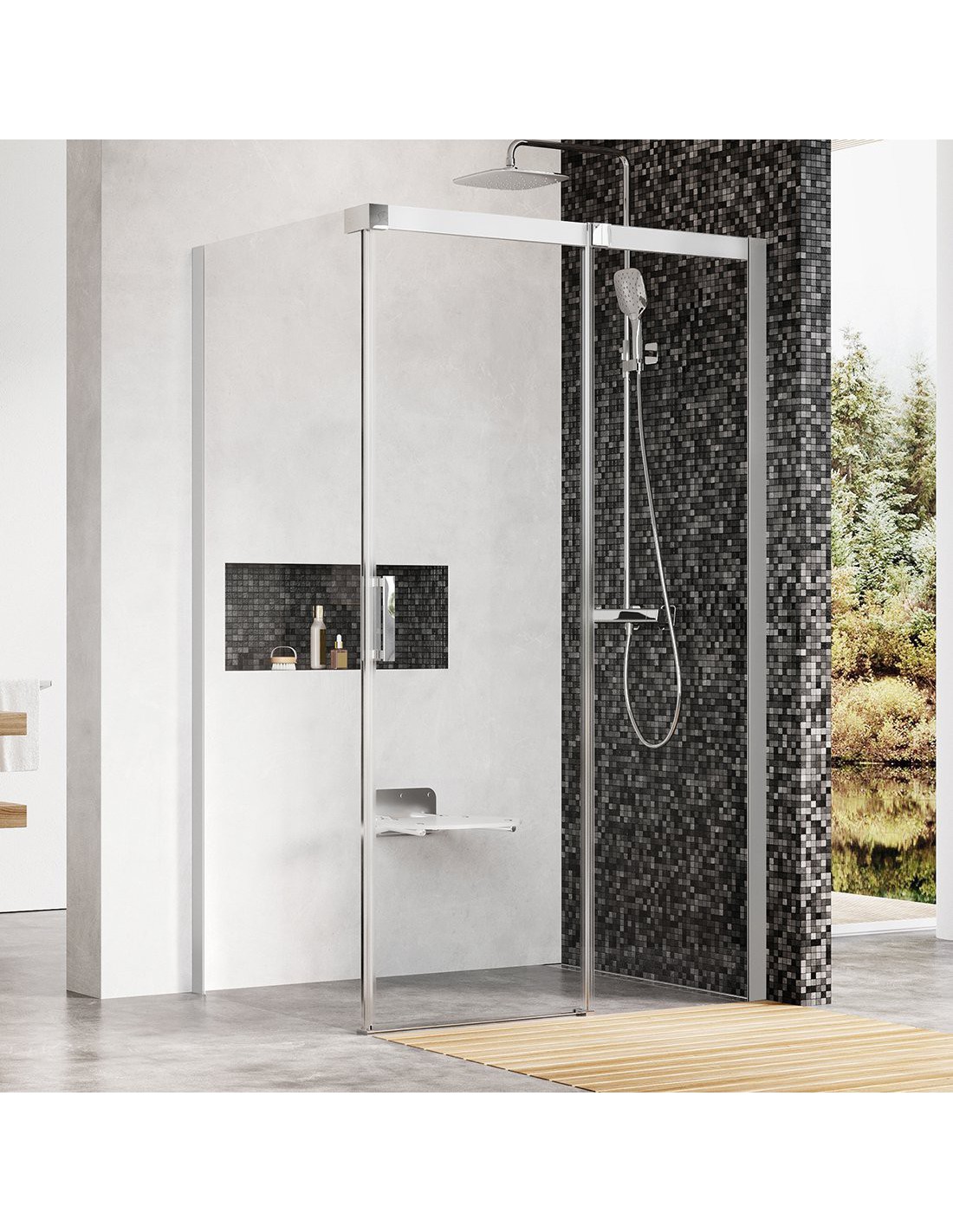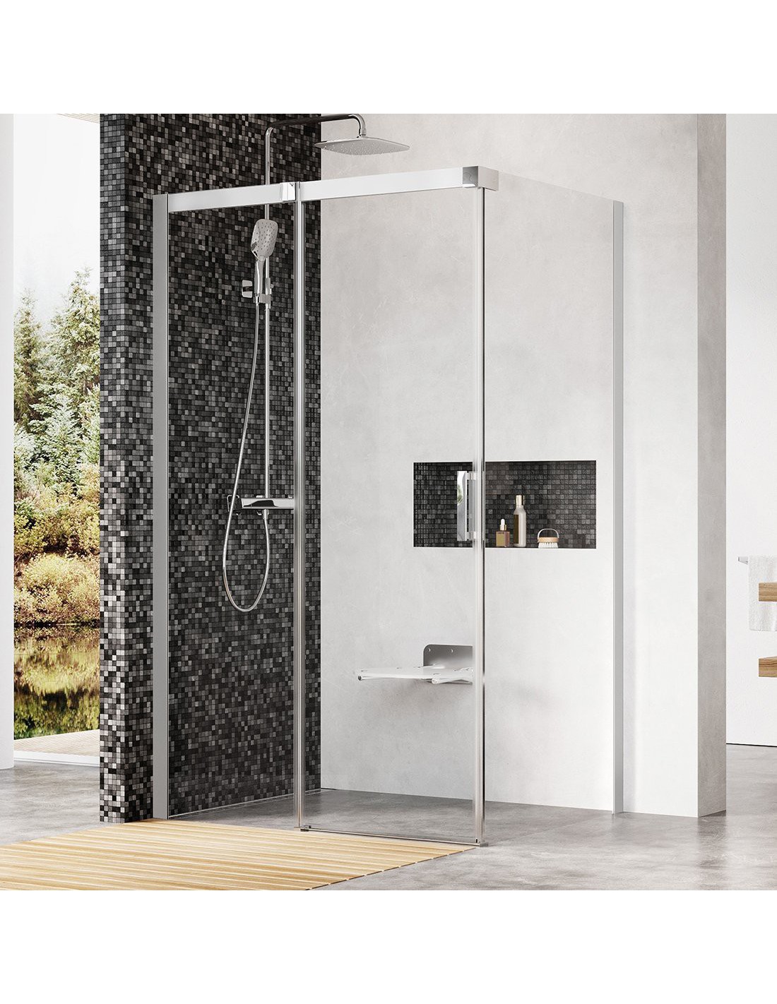 Prabangi kampinė dušo kabina su slankiojančiomis durimis, kurios suformuojamos derinant dušo duris su stacionaria sienele. Rinkdamiesi dušo kabinos matmenis atsižvelkite į vonios kambario dydį. Nepakeičiamas dizainas, kurį pabrėžia viršutinis ir šoniniai profiliai.