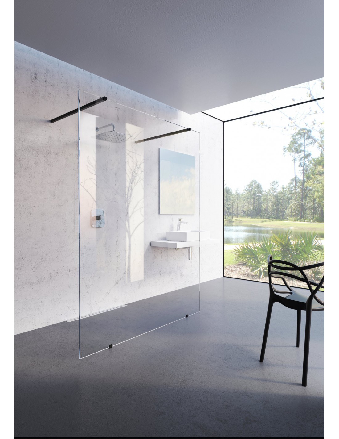 Dušo kabina Walk-In Free pagaminta iš 8 mm storio grūdinto saugaus stiklo. Gaminio stabilumą užtikrina du metaliniai sienelės laikikliai, nustatantys atviro įėjimo plotį. Dušo kabina Walk-In Free su juodos spalvos metalinių dalių apdaila, rekomenduojame montuoti ant Ravak dušo padėklų Slate Pro ar Sandstone Pro arba tiesiai ant grindų su įmontuotu dušo lataku. Komplektą sudaro stacionari stiklo sienelė ir juodos apdailos laikikliai. Universalūs 120 cm ilgio laikikliai gali būti trumpinami, pagal reikiamą įėjimo plotį. Laikikliai turi metalinį dangtelį, kuris dengia pjūvį.