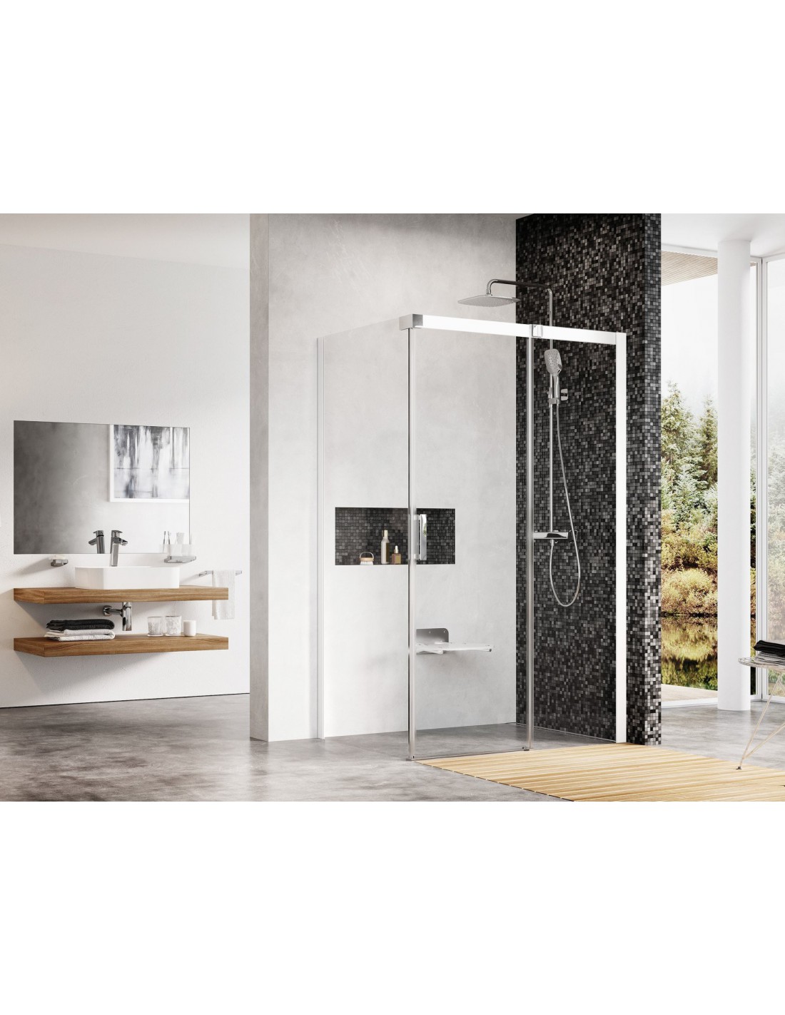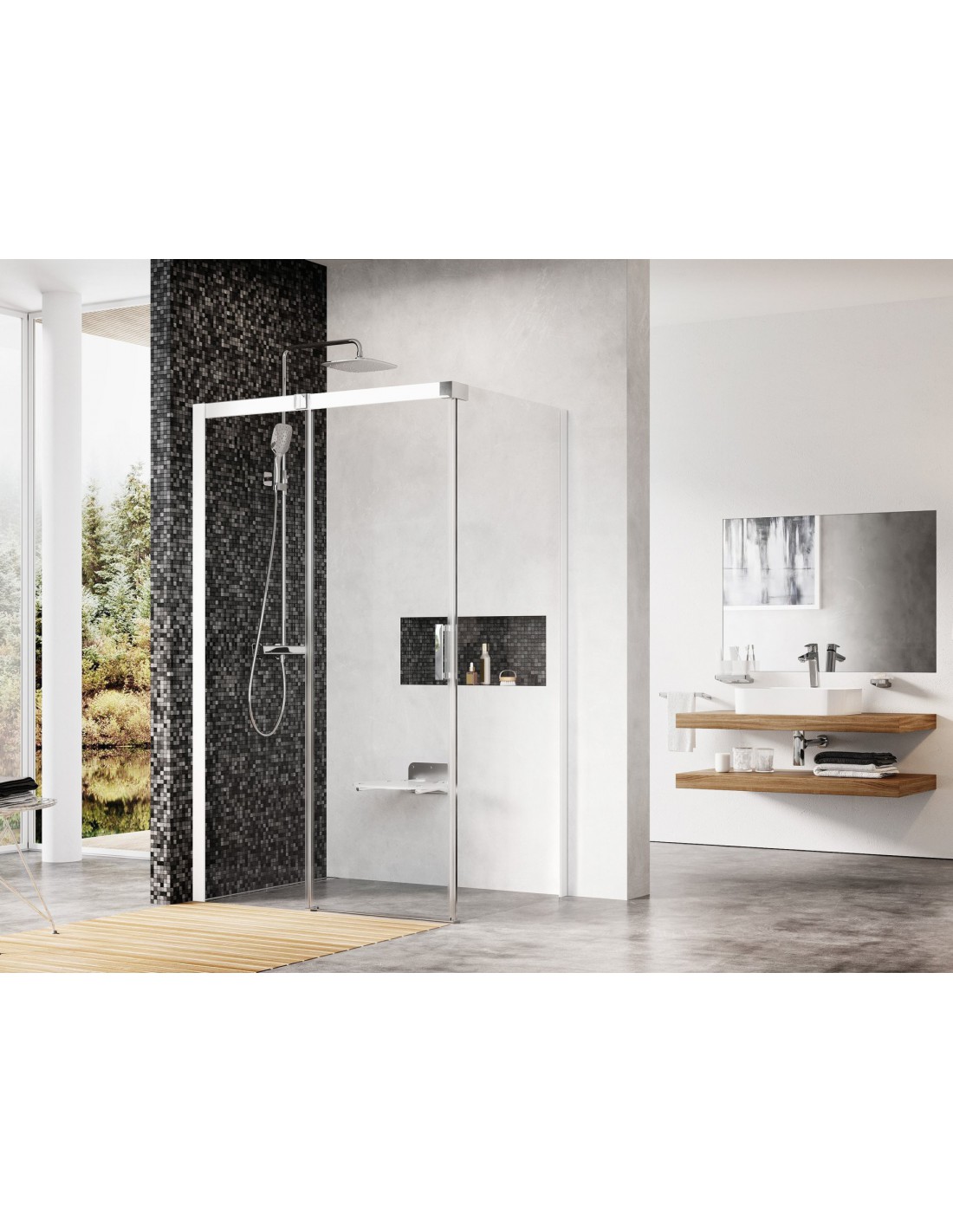 Gaminį sudaro dvi dalys, stacionari sienelė ir slankiojančios durys. Montuojama plytelėmis išklotame vonios kambaryje tiesiai ant grindų su įmontuotu nutekamuoju lataku.