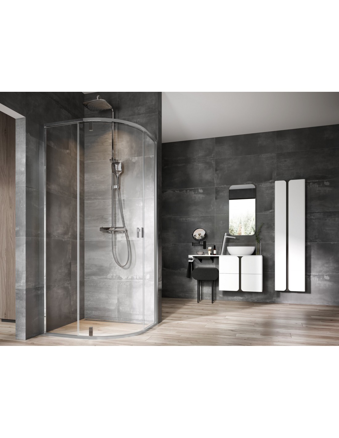 Pusapvalė dušo kabina Nexty su blizgaus chromo rėmu ir skaidriu stiklu, padengtu Ravak AntiCalc® apsauginiu sluoksniu. Varstomos durys.