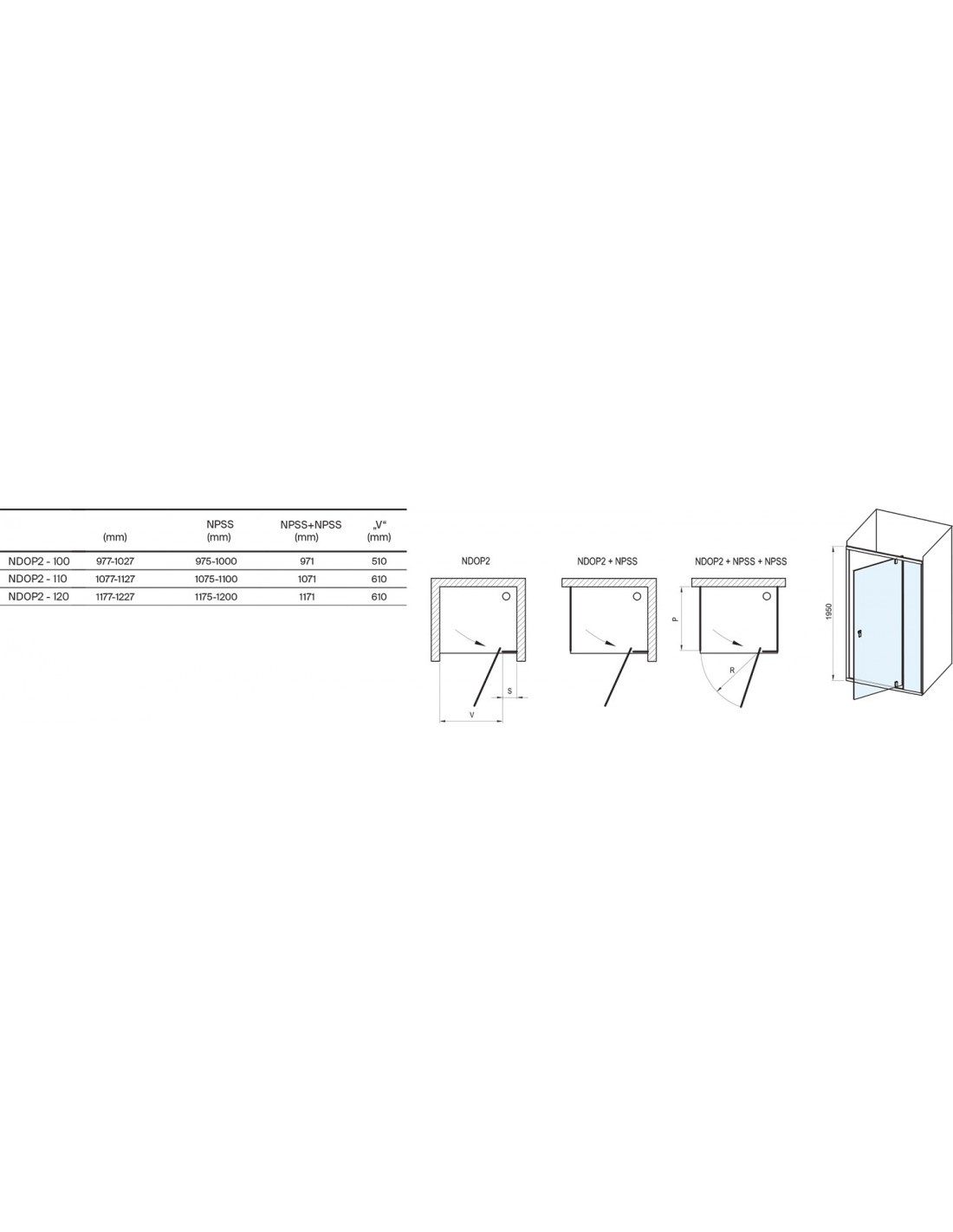 Gaminį sudaro viena lygi nejudanti dalis ir viena lygi pasukama dalis - durys. Pasukę gaminį 180°, gausite kairįjį arba dešinįjį įėjimo variantą. Montuojama į plytelėmis išklotą vonios kambario kampą (idealiai tinka į mūrinę nišą arba kombinuojant kartu su stacionaria sienele NPSS) ant Ravak Perseus Pro, Perseus Pro Chrome, Gigant Pro, Gigant Pro Flat, Gigant Pro Chrome, Slate Pro padėklų arba tiesiai ant grindų su įrengtu nutekamuoju lataku. Kombinuojant su dviem NPSS stacionariomis sienelėmis galima sukurti U tipo dušo kabiną. Naudojant praplėtimo profilį NNPS, gaminius galima išplėsti 20 mm, todėl jie puikiai prisitaiko prie statybinių nelygumų iki 4 cm kiekvienoje pusėje.