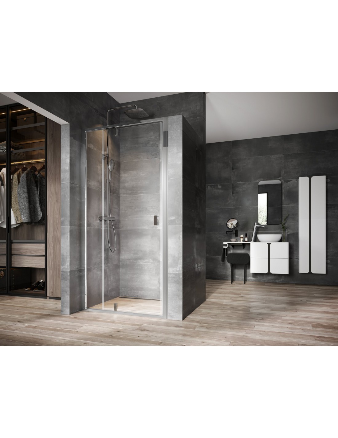 Gaminį sudaro viena lygi nejudanti dalis ir viena lygi pasukama dalis - durys. Pasukę gaminį 180°, gausite kairįjį arba dešinįjį įėjimo variantą. Montuojama į plytelėmis išklotą vonios kambario kampą (idealiai tinka į mūrinę nišą arba kombinuojant kartu su stacionaria sienele NPSS) ant Ravak Perseus Pro, Perseus Pro Chrome, Gigant Pro, Gigant Pro Flat, Gigant Pro Chrome, Slate Pro° padėklų arba tiesiai ant grindų su įrengtu nutekamuoju lataku. Kombinuojant su dviem NPSS stacionariomis sienelėmis galima sukurti U tipo dušo kabiną. Naudojant praplėtimo profilį NNPS, gaminius galima išplėsti 20 mm, todėl jie puikiai prisitaiko prie statybinių nelygumų iki 4 cm kiekvienoje pusėje.