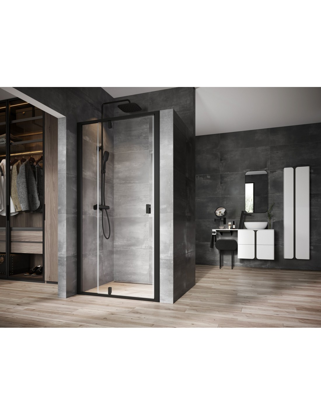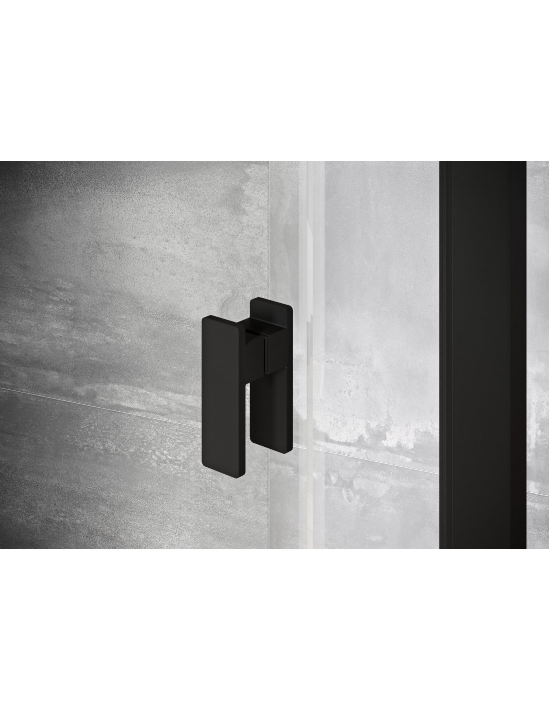 Dušo durys Nexty, juodos spalvos rėmas ir skaidrus stiklas, padengtas Ravak AntiCalc® apsauginiu sluoksniu. Varstomos. Gaminys gali būti montuojamas tiek kairėje, tiek dešinėje pusėje.