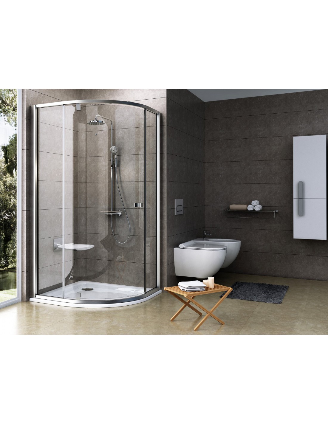 Pusapvalė dušo kabina Pivot su matinio chromo rėmu ir skaidraus stiklo užpildu, padengtu Ravak AntiCalc® apsauginiu sluoksniu. Varstomos durys.