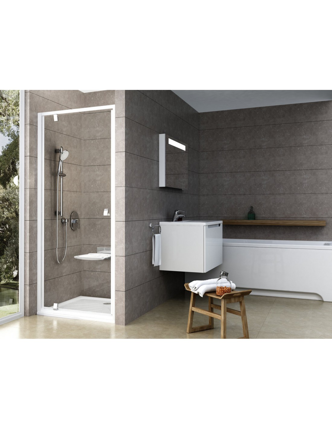 Dušo kabinos durys Pivot su baltos spalvos rėmu, chromuotomis rankenomis ir vyriais. Užpildas iš skaidraus stiklo su Ravak AntiCalc® apsauginiu sluoksniu. Varstomos. Gaminys gali būti montuojamas tiek kairėje, tiek dešinėje pusėje.