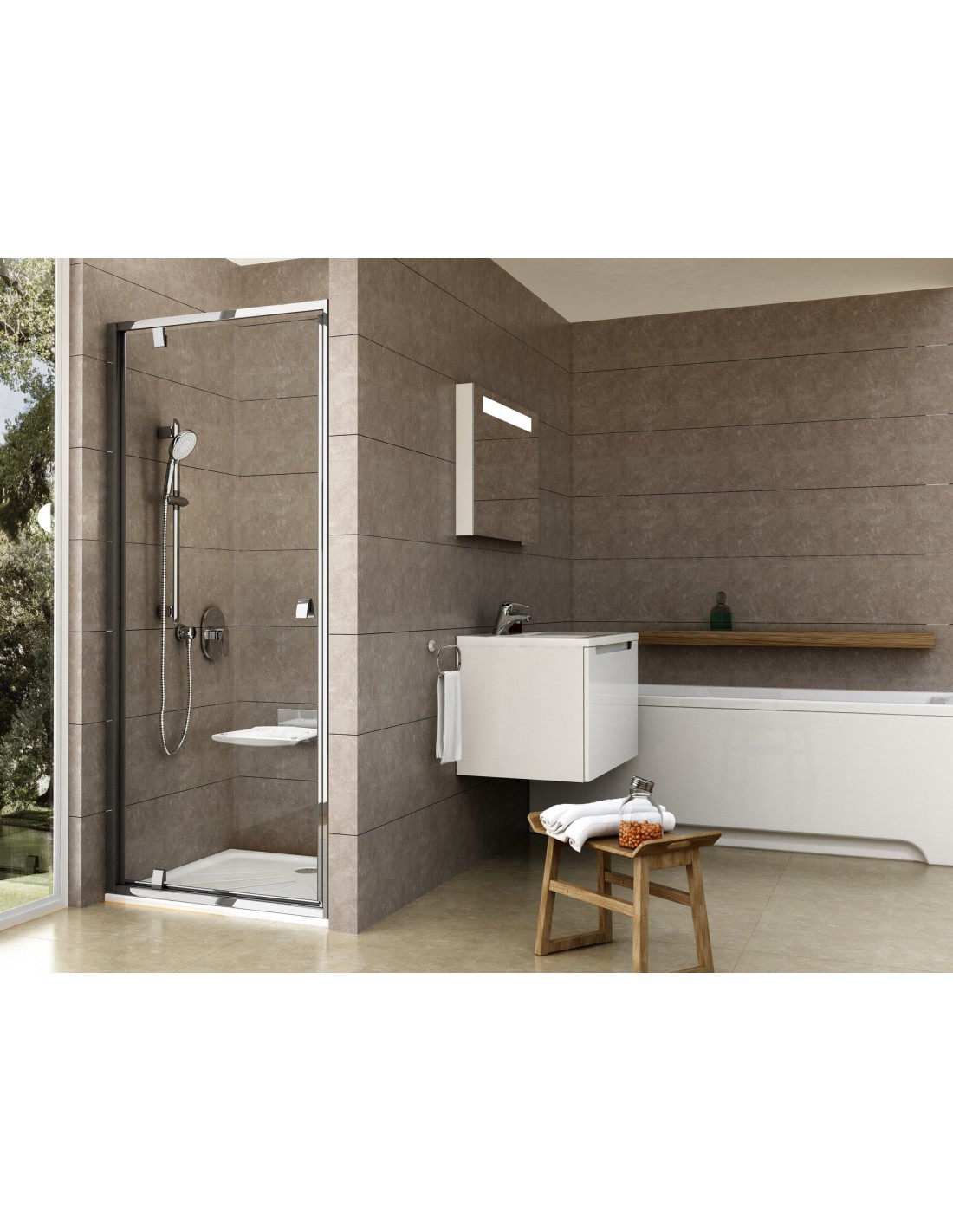 Dušo kabinos durys Pivot su blizgaus chromo rėmu ir skaidraus stiklo užpildu, padengtu Ravak AntiCalc® apsauginiu sluoksniu. Varstomos. Gaminys gali būti montuojamas tiek kairėje, tiek dešinėje pusėje.