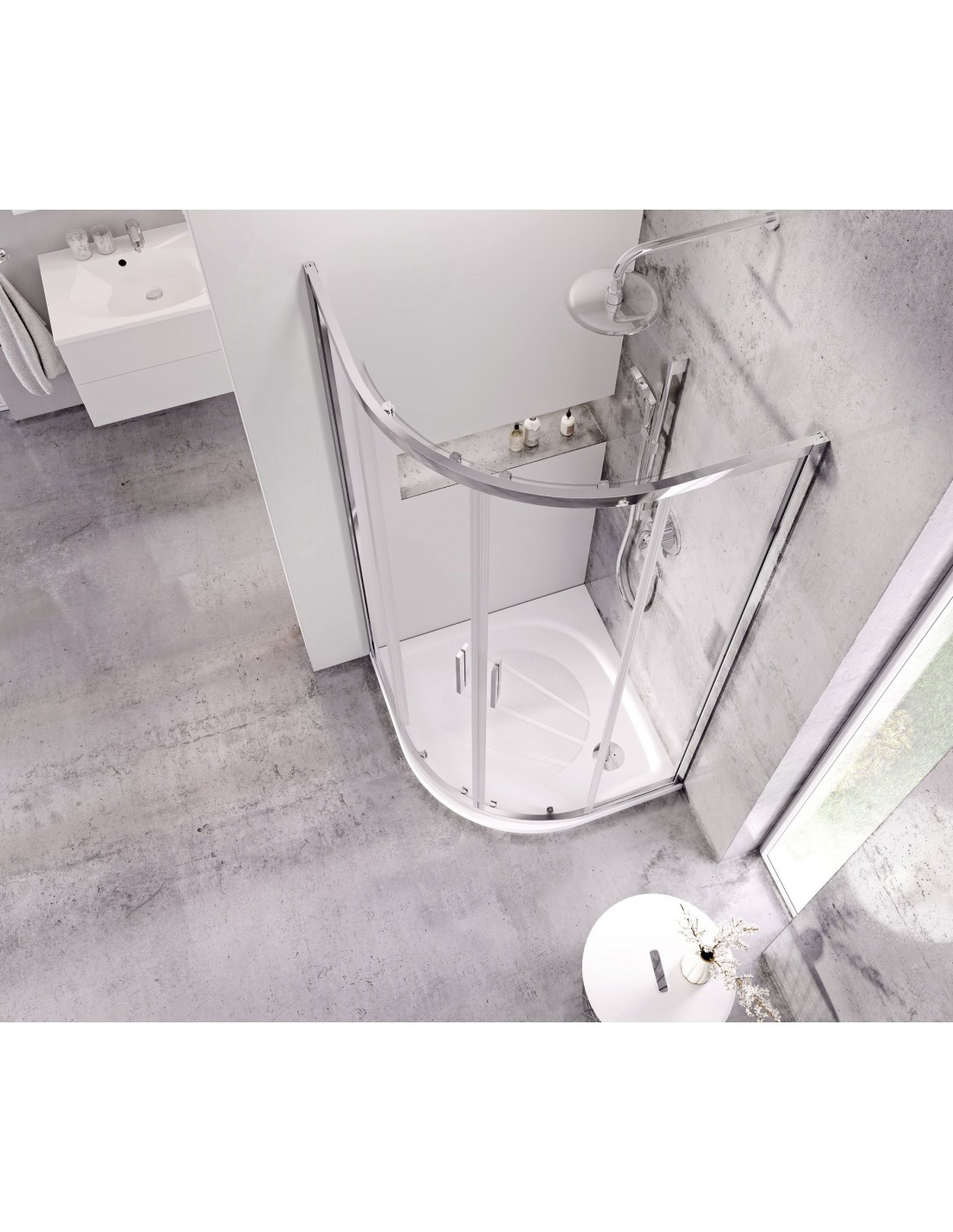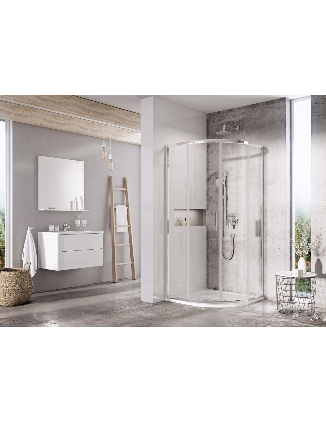 Pusapvalė dušo kabina Blix Slim, blizgaus chromo profiliai su skaidraus stiklo užpildu su Ravak AntiCalc® apsauginiu sluoksniu. Stumdomoji atidarymo sistema.