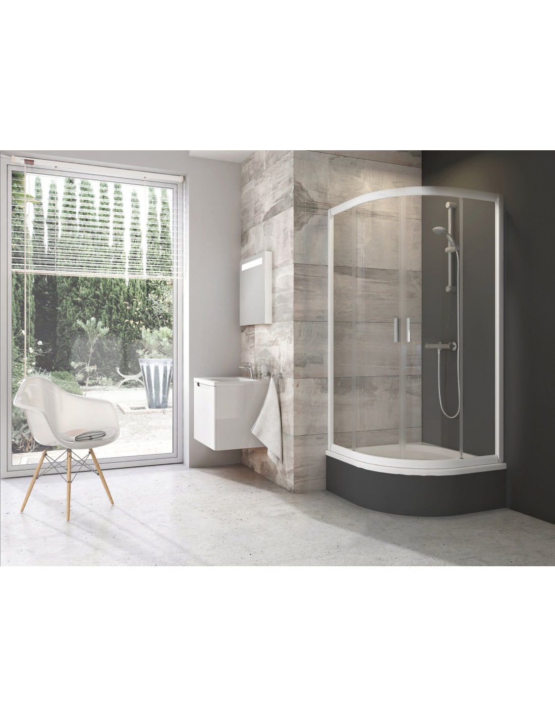 Neaukštos pusapvalės dušo kabinos Blix aukštis tik 1750 mm, todėl ją patogu įrengti kartu su giliu dušo padėklu Sabina. Ši kombinacija – tai unikalus, daug erdvės nereikalaujantis sprendimas, taupantis vietą ir sukuriantis sąlygas maudytis tiek vonioje, tiek po dušu. Akrilinis padėklas, kurio gylis 27 cm, tinka ne tik patogiai maudyti vaikus, užmerkti skalbinius, bet ir sėdėti. Stumdoma dušo kabinos Blix sistema garantuoja techninį tobulumą ir madingą dizainą su poliruotais profiliais ir efektingu saugaus stiklo paviršiumi. Įrengiama vonios kambario kampe su apdaila ant gilaus padėklo Sabina.