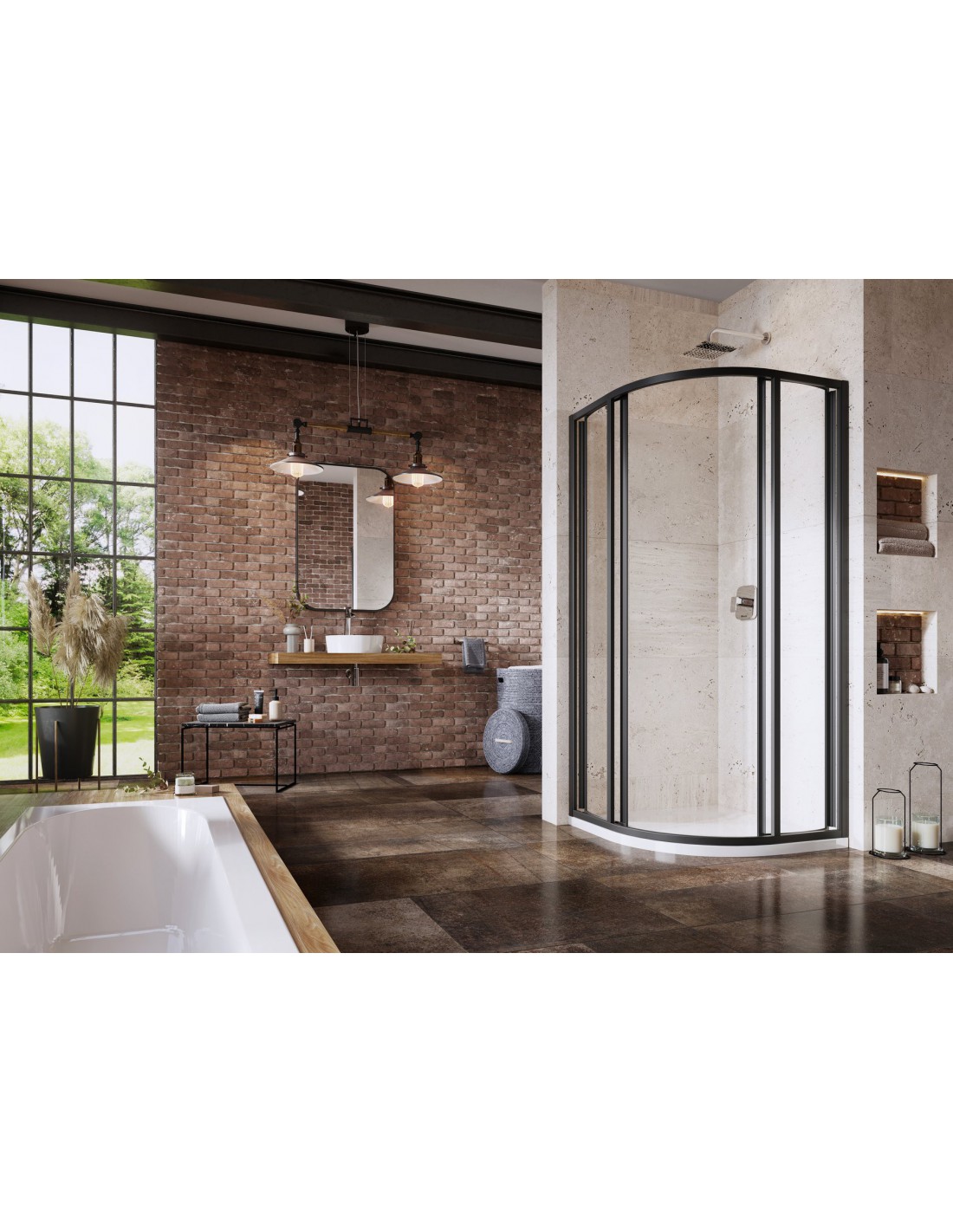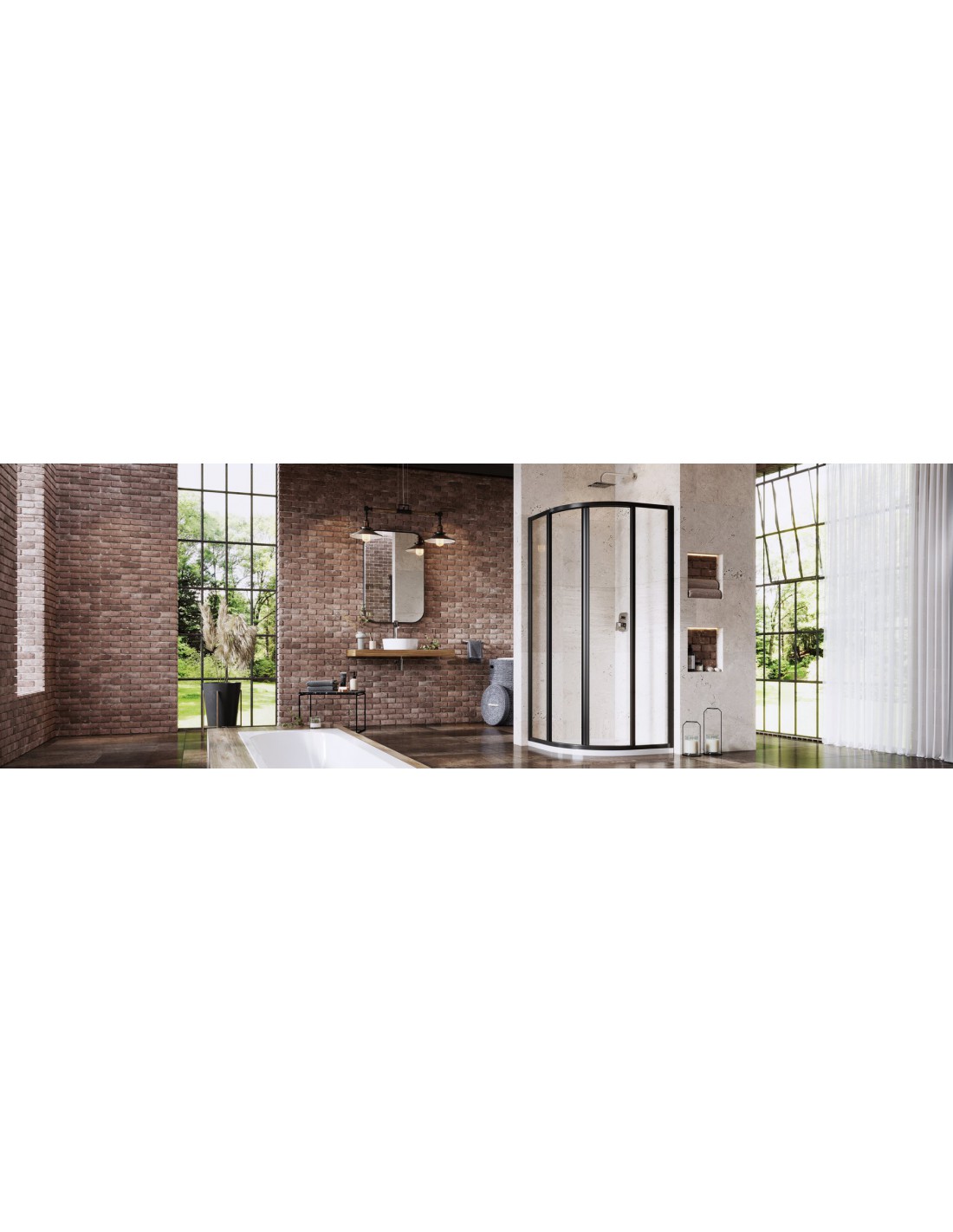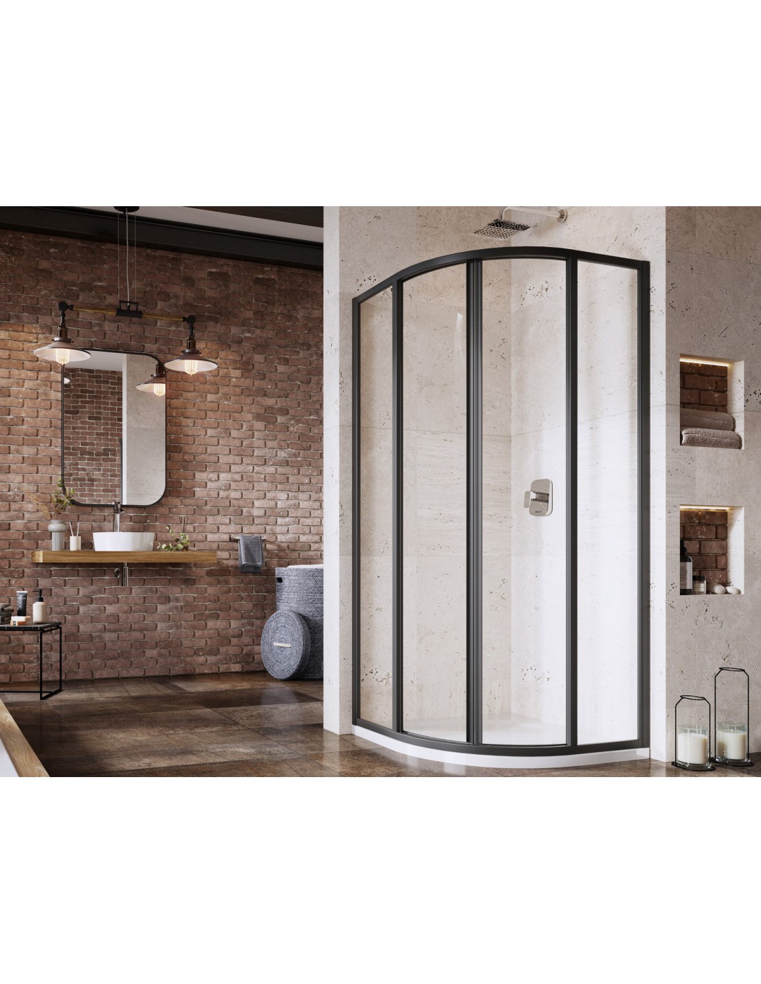 Pusapvalė dušo kabina Supernova, juodos spalvos profiliai su nepermatomo plastiko Pearl užpildu. Stumdomoji atidarymo sistema.