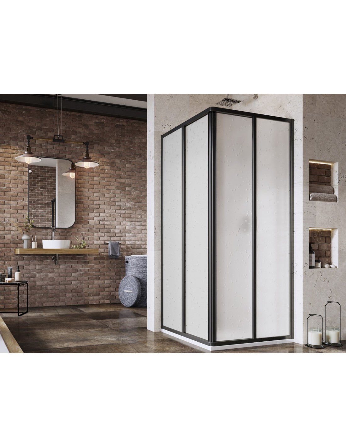 Dušo kabina Supernova, juodos spalvos profiliai su nepermatomo plastiko Pearl užpildu. Stumdomoji atidarymo sistema. Komplekte dvejos dušo durys.