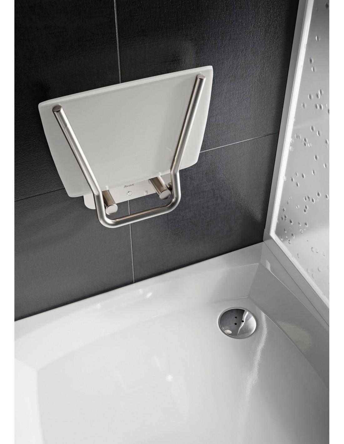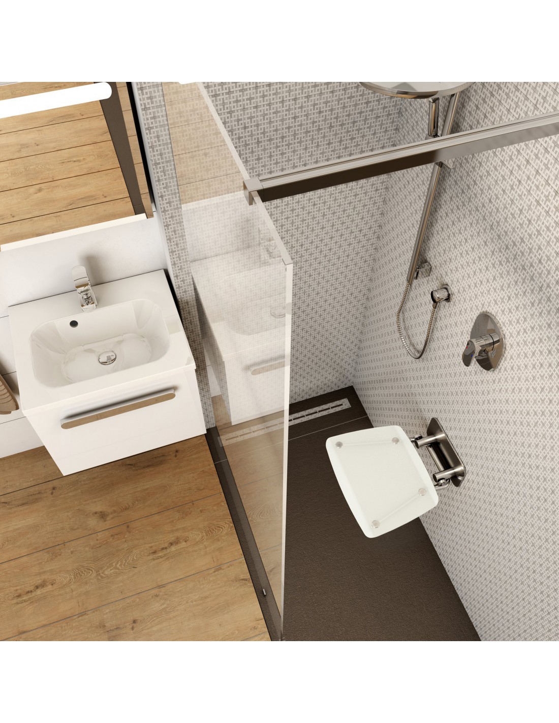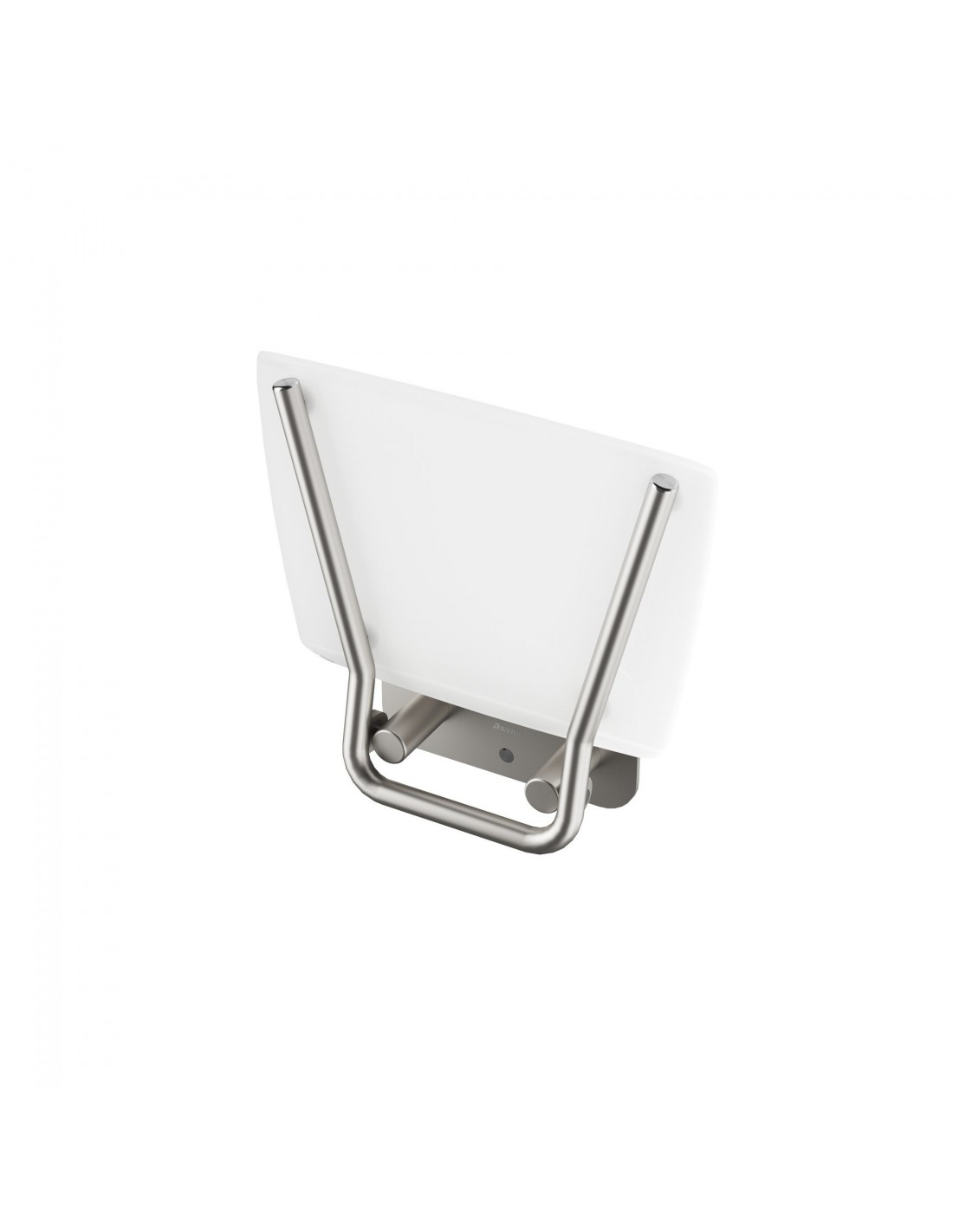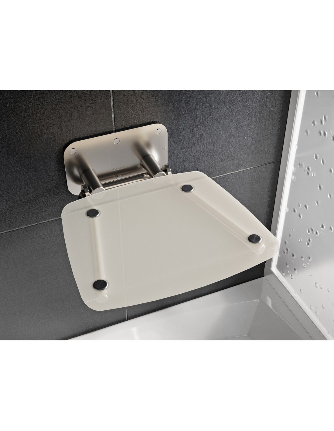 Kvadratinė sulankstoma dušo dušo sėdynė Ovo B II. Nerūdijančio plieno konstrukcija su skaidriai balta sėdyne.