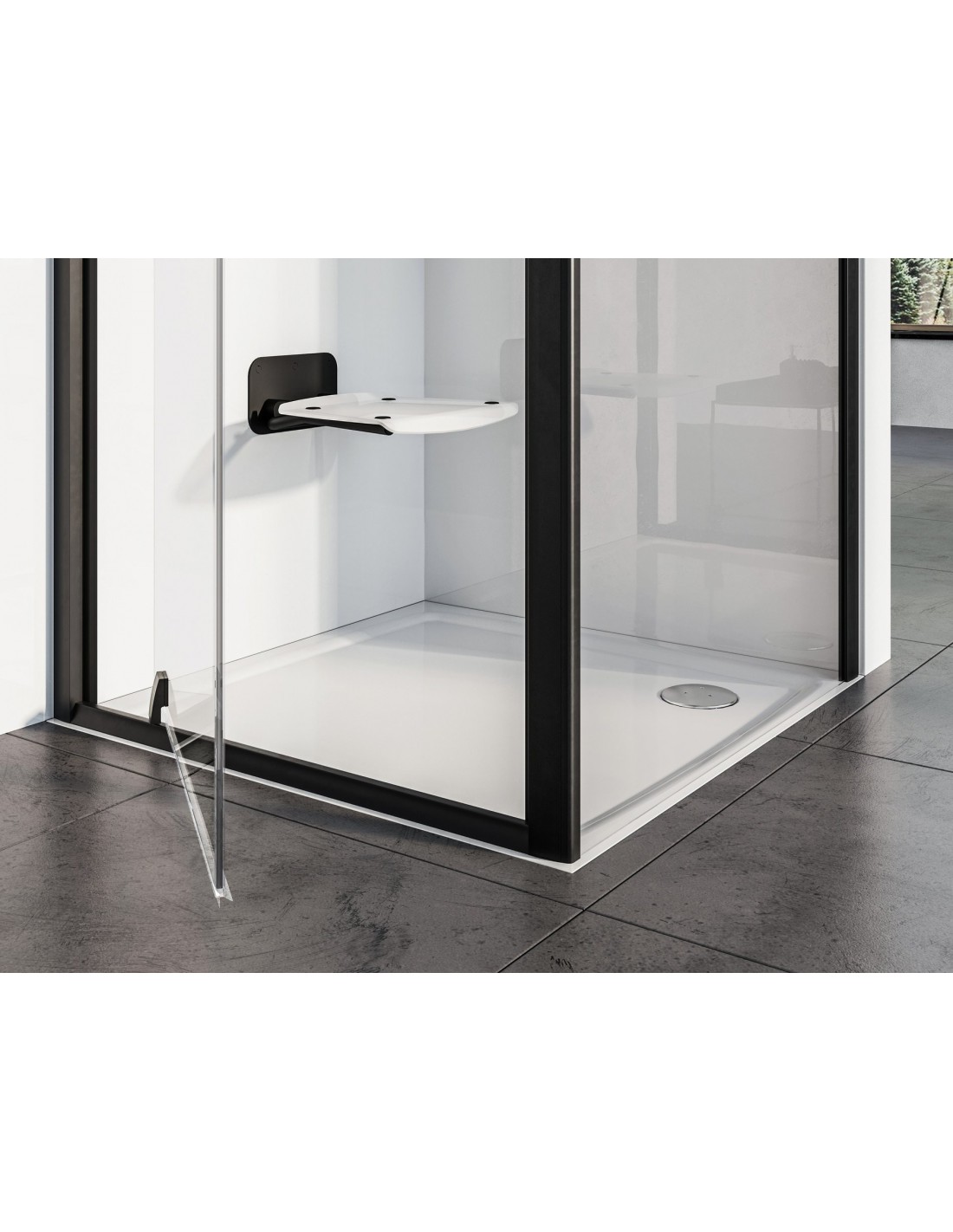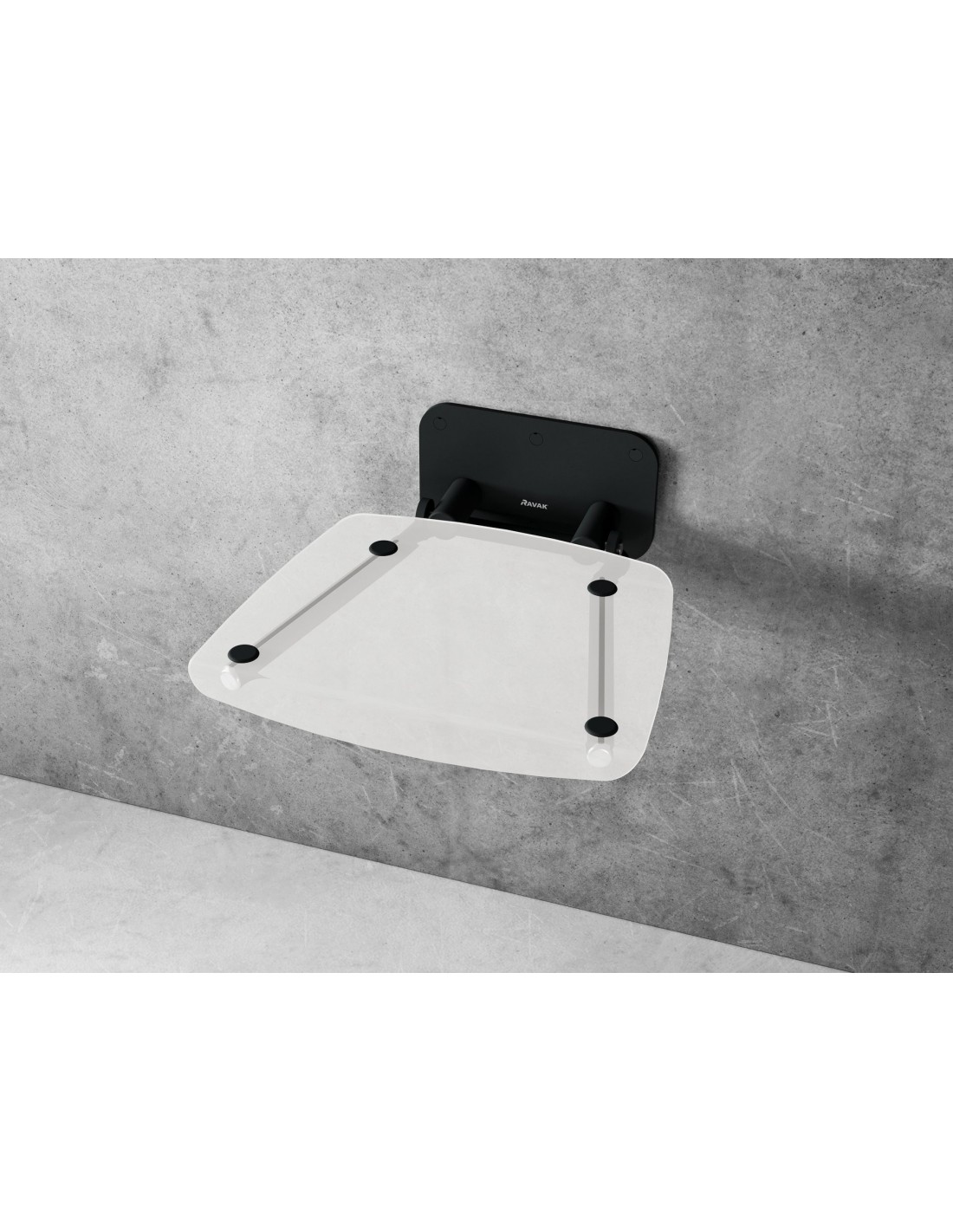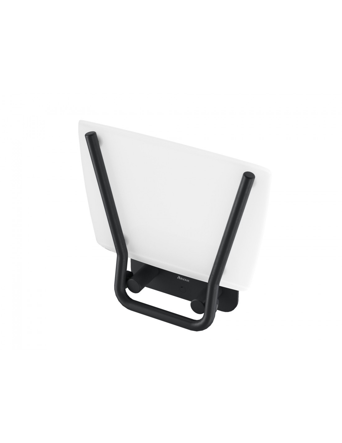 Ovalo formos sulankstoma dušo sėdynė Ovo P II. Juodos konstrukcijos su skaidriai balto opalo sėdyne.