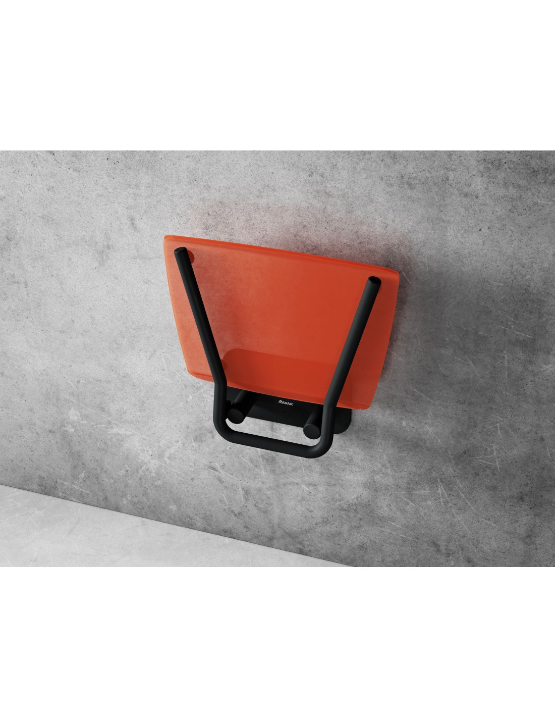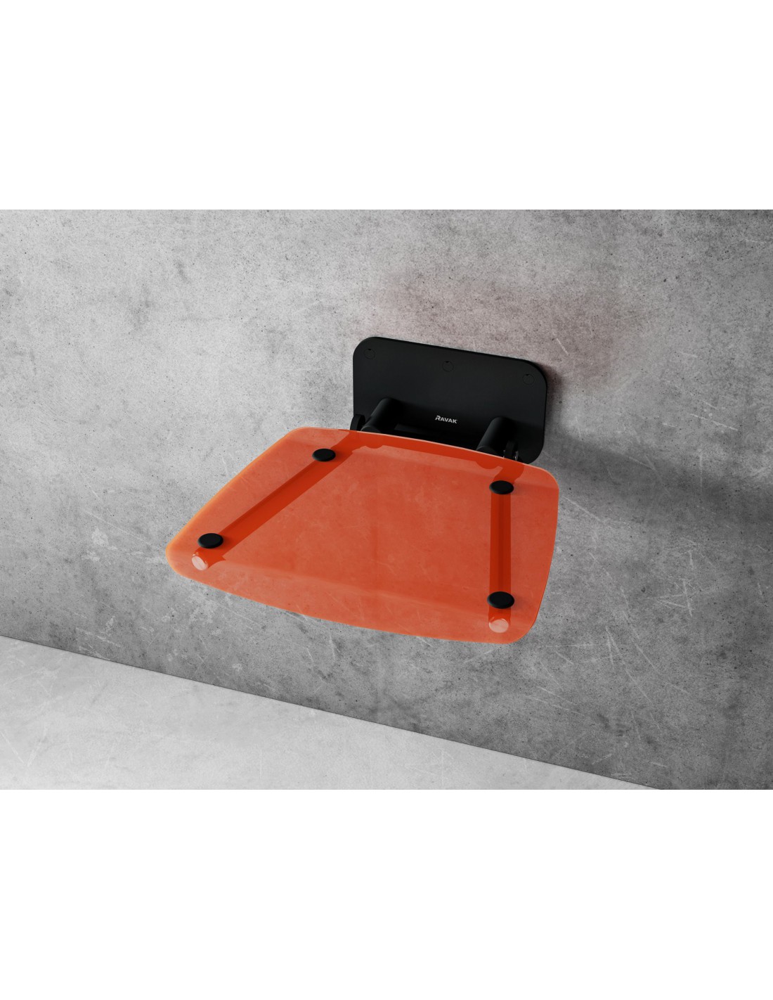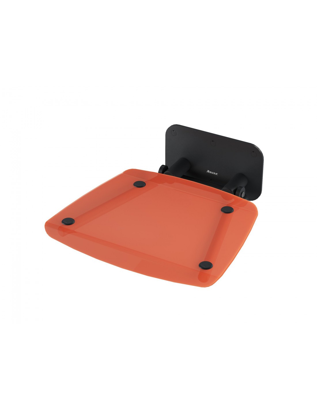 Kvadratinė sulankstoma dušo sėdynė Ovo B II. Juoda konstrukcija su skaidriai oranžine sėdyne.