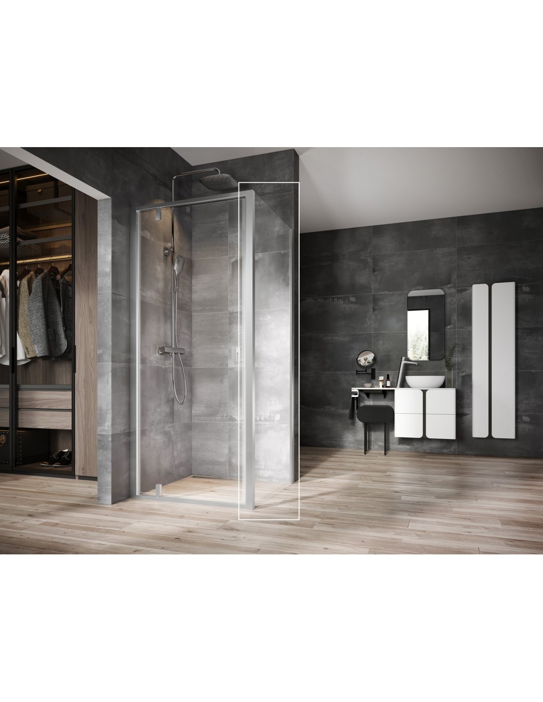 Stacionari dušo kabinos sienelė Nexty, matinio chromo rėmas su skaidraus stiklo užpildu, padengtu apsauginiu sluoksniu Ravak AntiCalc®. Gaminys gali būti montuojamas tiek kairėje, tiek dešinėje pusėje.