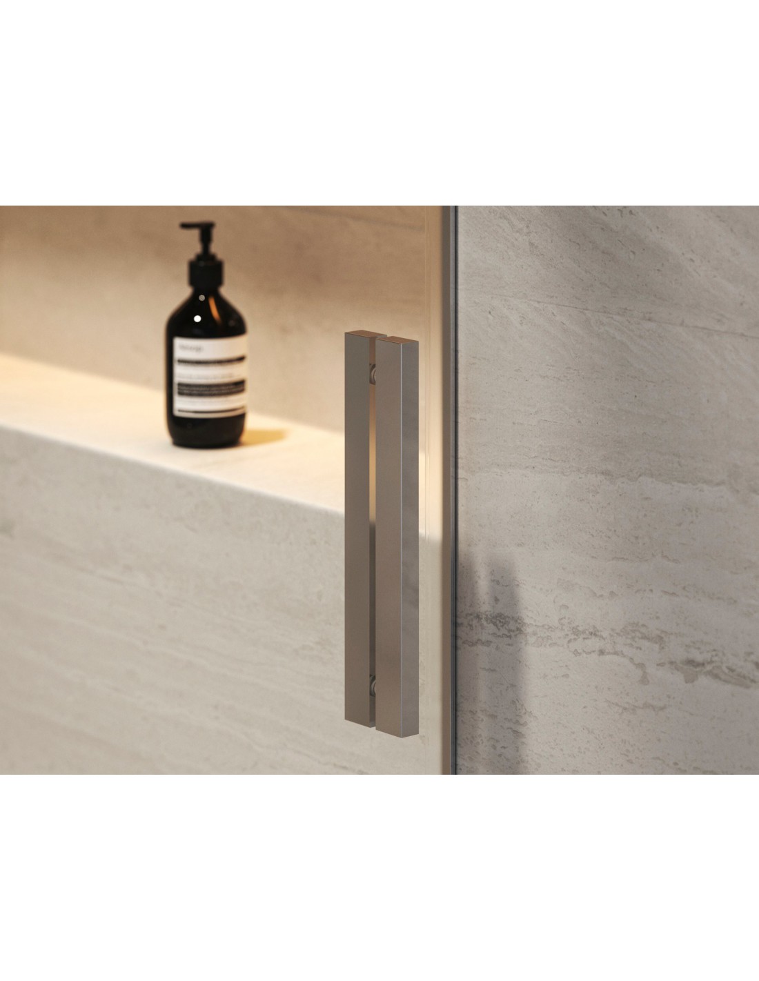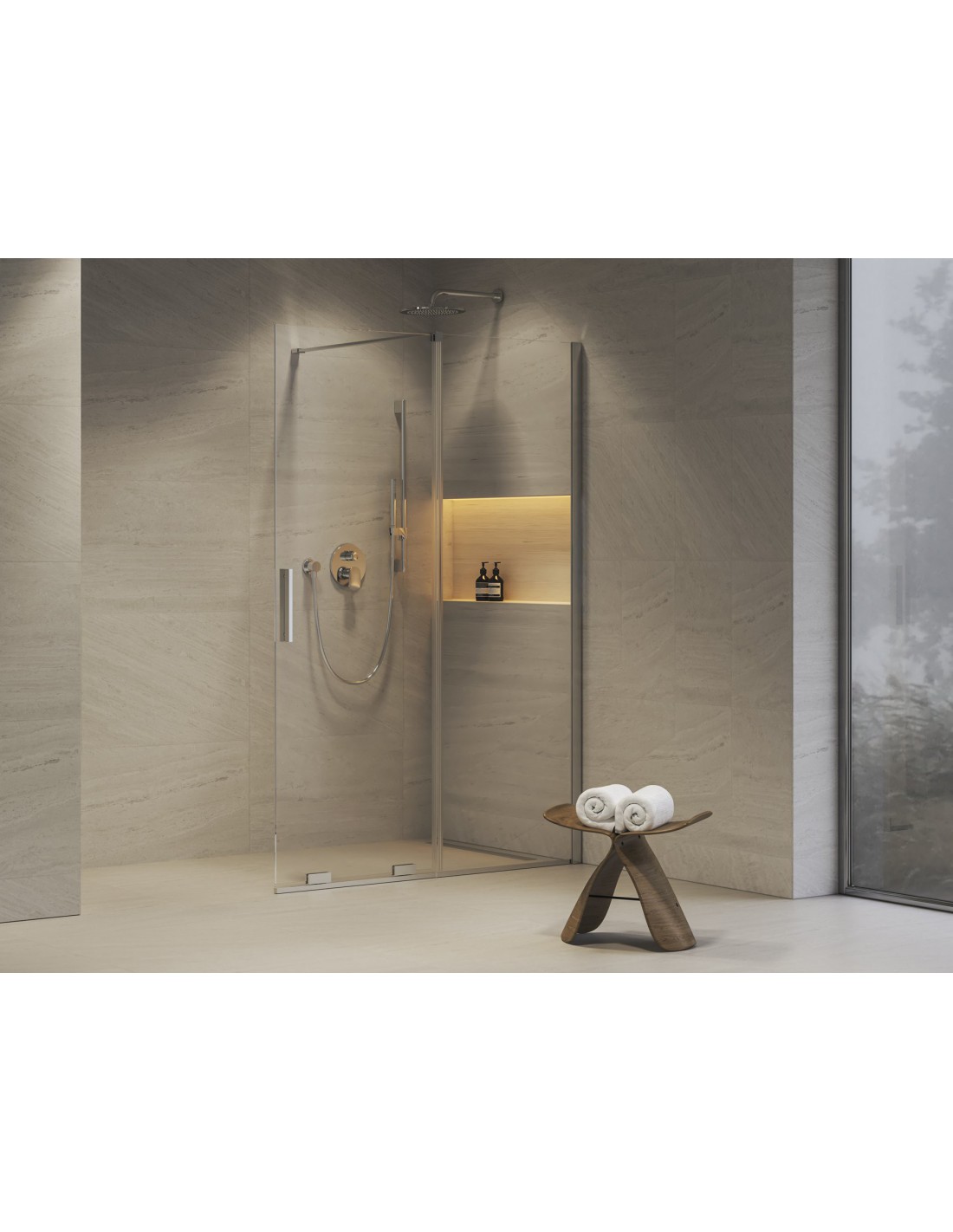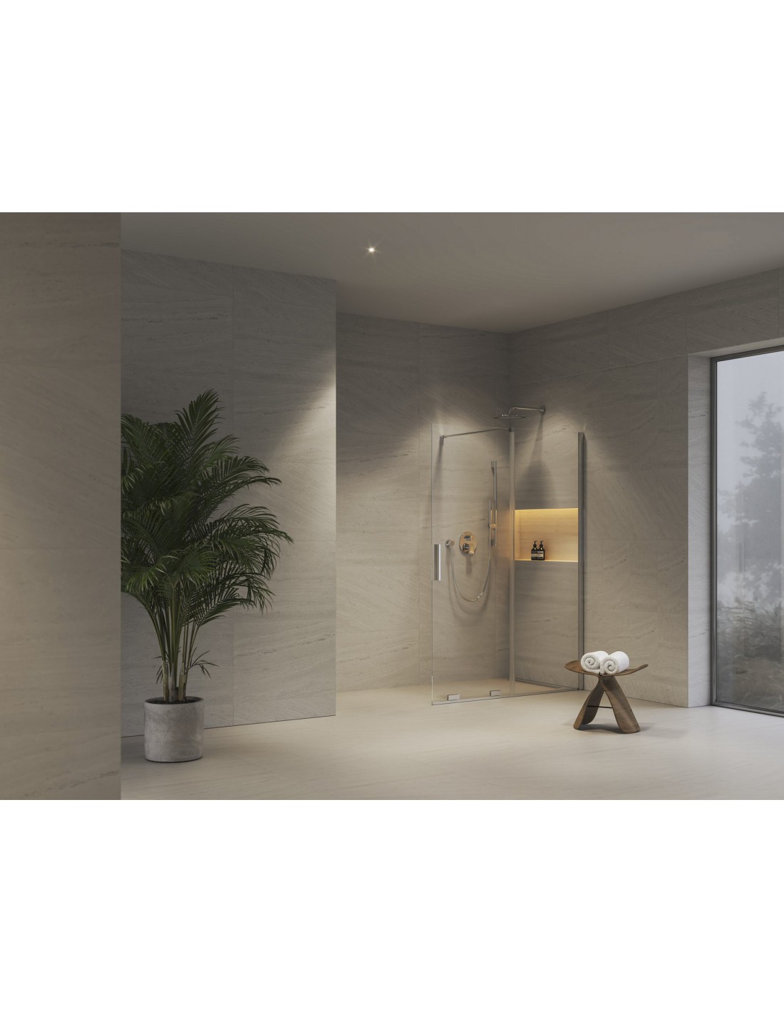Dviejų dalių dušo kabina Walk-In Roll su atviru įėjimu vienoje pusėje ir stumdoma sienele. Chromo profilis su skaidraus stiklo užpildu, padengtu apsauginiu sluoksniu Ravak AntiCalc®. Pasukamas gaminys, galimas kairinis ir dešininis variantas.