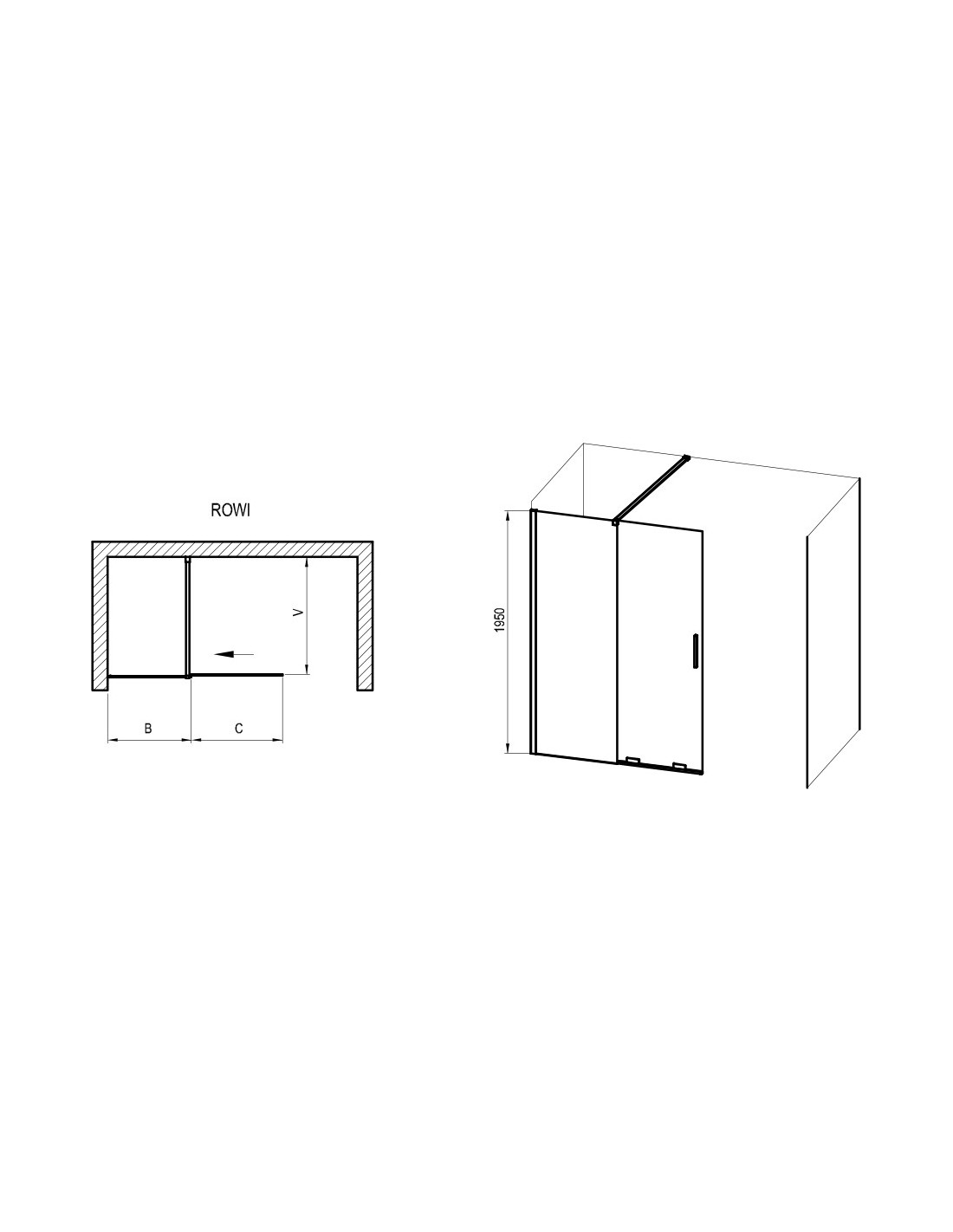 Dviejų dalių dušo kabina ROWI Walk-In. Gaminį sudaro atrama, stacionari sienelė ir stumdoma sienelė apatiniais bėgeliais. Gaminio stabilumą užtikrina 100 cm ilgio metalinis statramstis, kurį galima sutrumpinti iki norimo įėjimo pločio. Surinkimo metu galite pasirinkti įėjimą iš kairės arba dešinės, perkeldami fiksuotą stiklą į kairę arba dešinę pusę ir vertikaliai pasukdami stumdomą dalį 180° kampu.