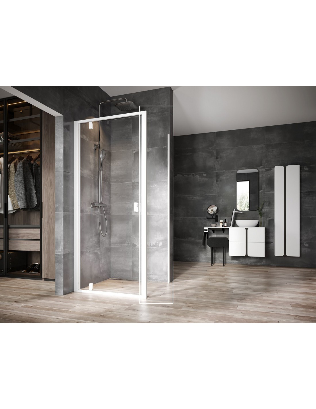 Stacionari dušo kabinos sienelė Nexty, baltos spalvos rėmas su skaidraus stiklo užpildu, padengtu apsauginiu sluoksniu Ravak AntiCalc®. Gaminys gali būti montuojamas tiek kairėje, tiek dešinėje pusėje.