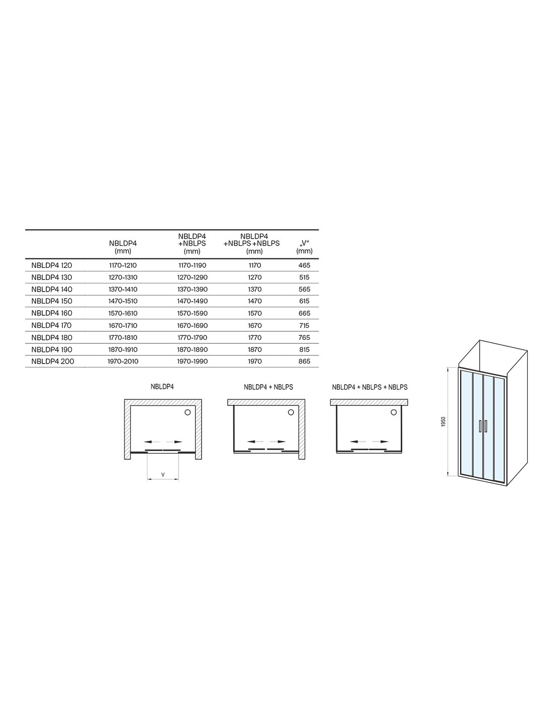 Gaminį sudaro viena stacionari sienelė. Montuojama į plytelėmis išklotą vonios kambario kampą (kombinuojant su dušo durimis NBLDP2 / NBLDP4), ant Ravak Perseus Pro, Perseus Pro Chrome, Gigant Pro, Gigant Pro Flat, Gigant Pro Chrome padėklo arba tiesiai ant grindų su įrengtu nutekamuoju lataku. Stacionari sienelė nėra skirta naudoti atskirai. Derinant dušo duris su dviem NBLPS sienelėmis, sukursite U formos dušo kabiną.