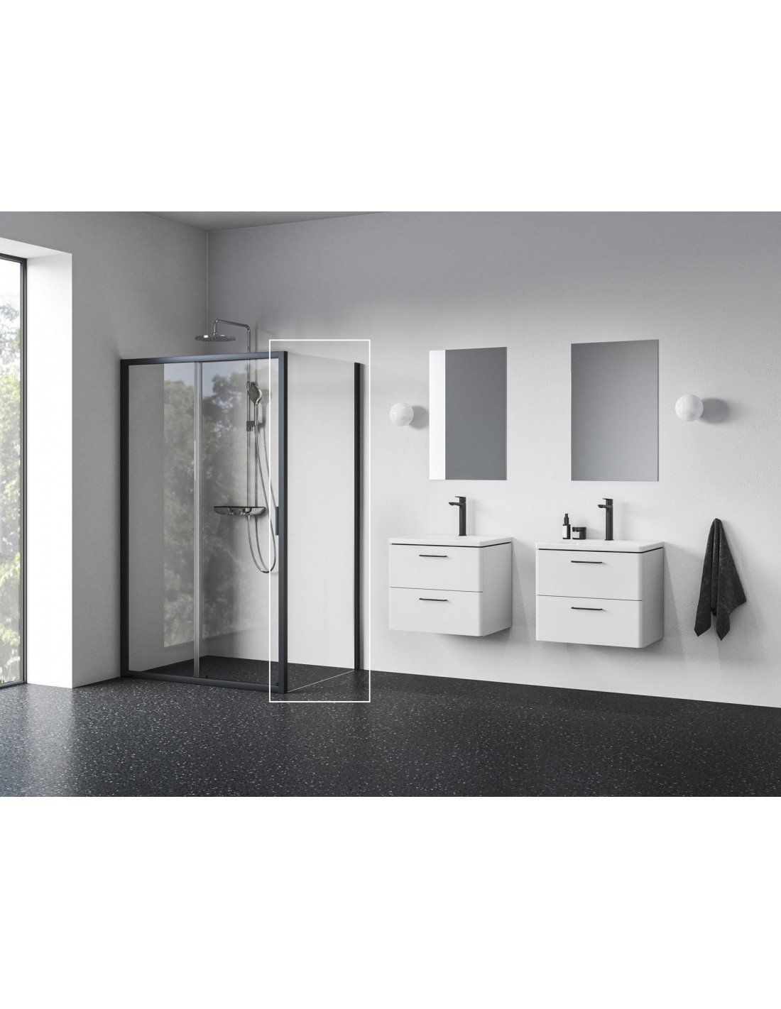 Dušo kabinos sienelė Blix II, juodos spalvos profilis su skaidraus stiklo užpildu, padengtu apsauginiu sluoksniu Ravak AntiCalc®. Sienelė gali būti naudojama tiek kairėje, tiek dešinėje pusėje.