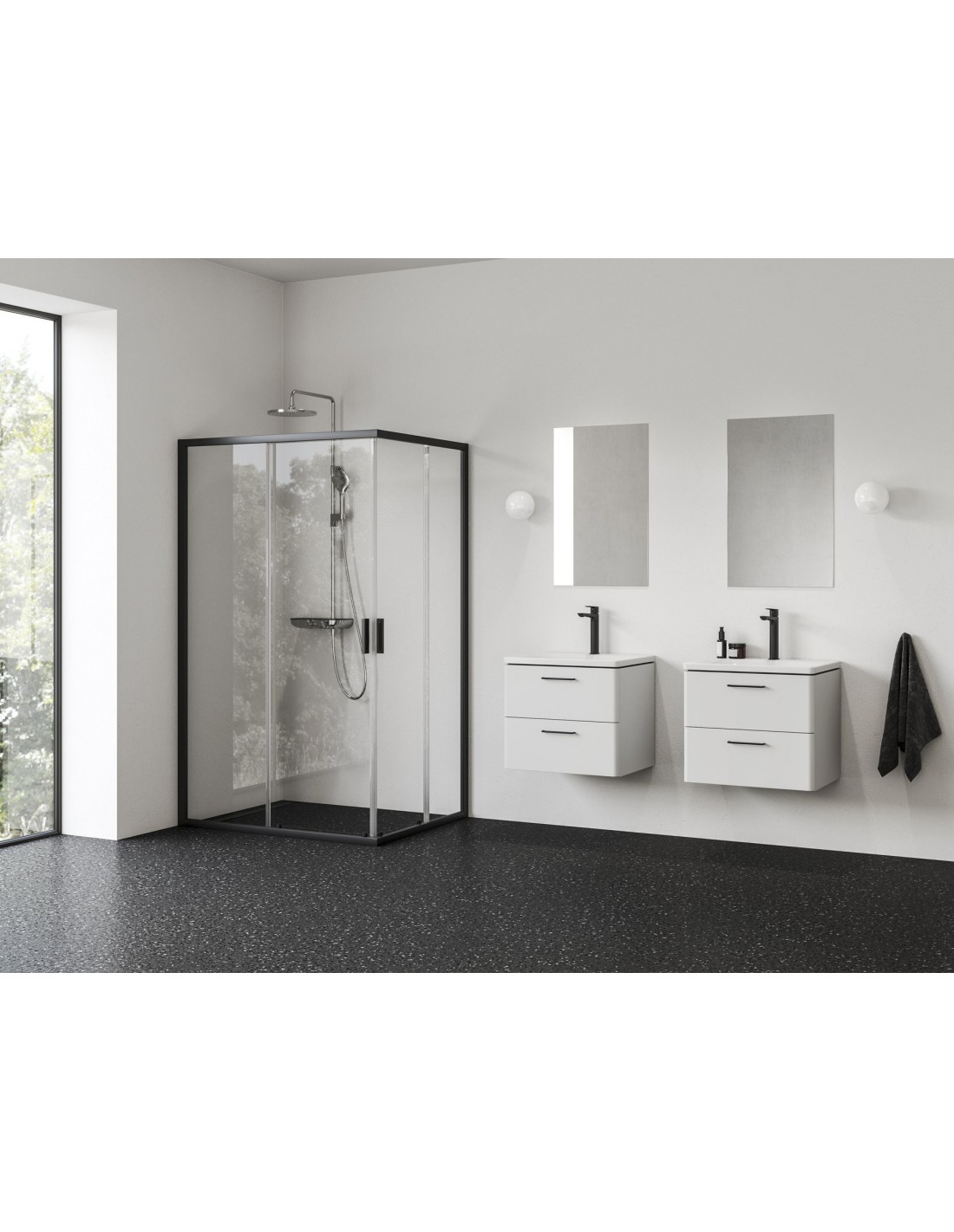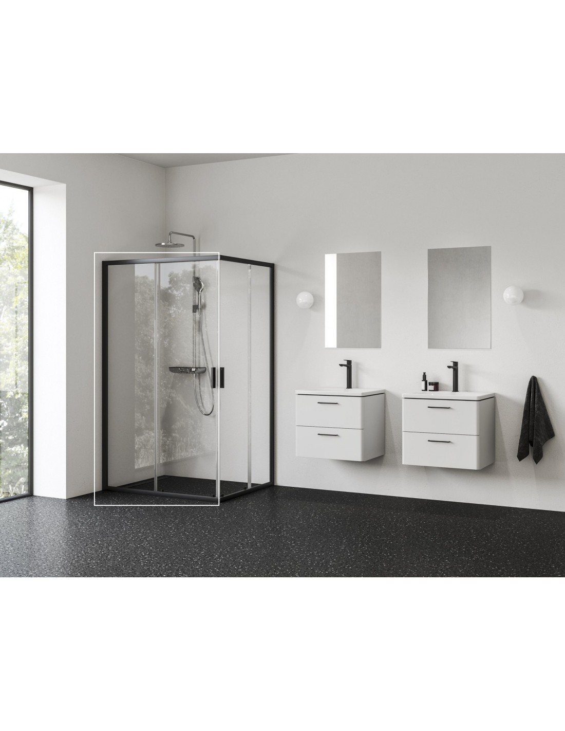 1/2 kampinės dušo kabinos Blix II dalis. Juodos spalvos profilis su skaidraus stiklo užpildu, padengtu Ravak AntiCalc® apsauginiu sluoksniu. Stumdoma atidarymo sistema. Pilną dušo kabiną sudaryti reikalingi du gaminiai, parduodami atskirai.