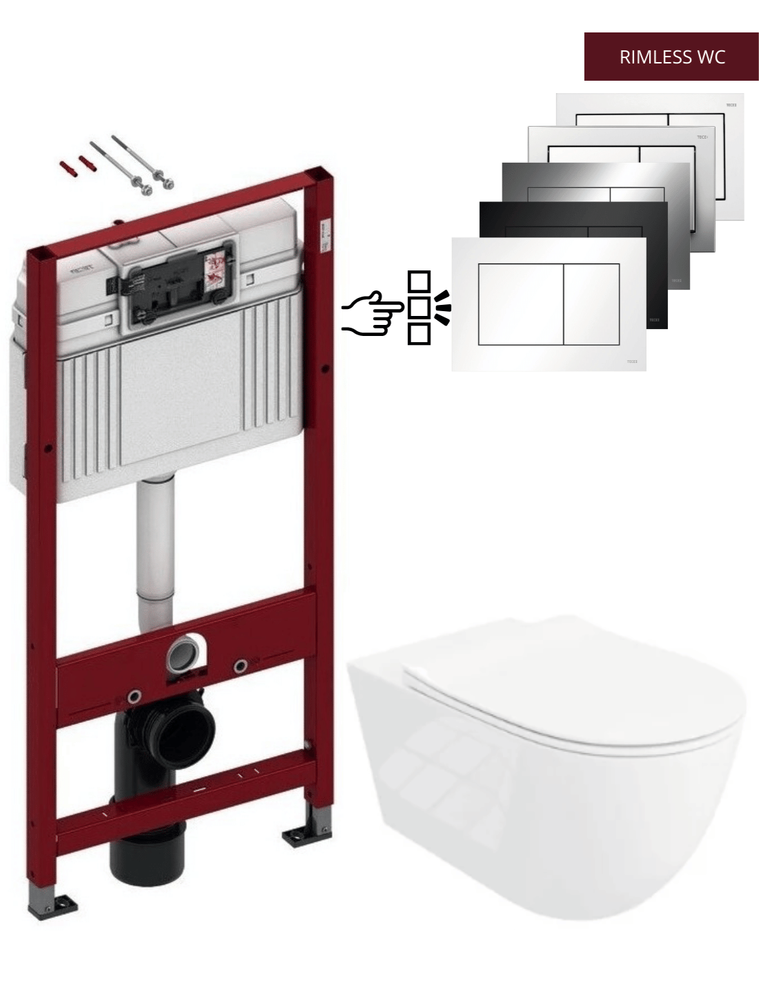 - Pasirinktas vienas WC nuleidimo mygtukas (pasirinkime: TeceNow - baltos, juodos matinės arba chromo spalvos, TeceBase – baltos arba chromo spalvos)