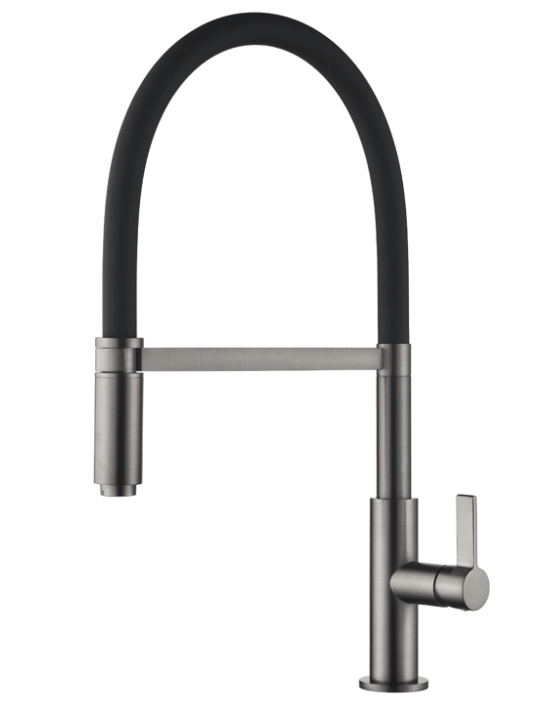 Aukštas, ištraukiamas maišytuvas su lanksčia silikonine juoda žarna
