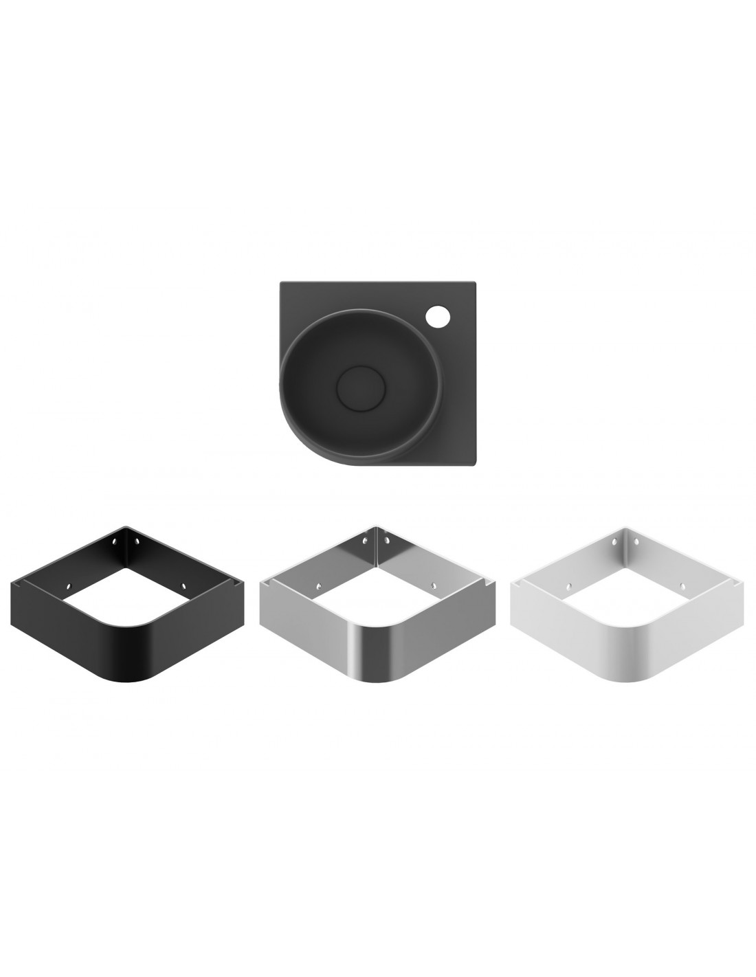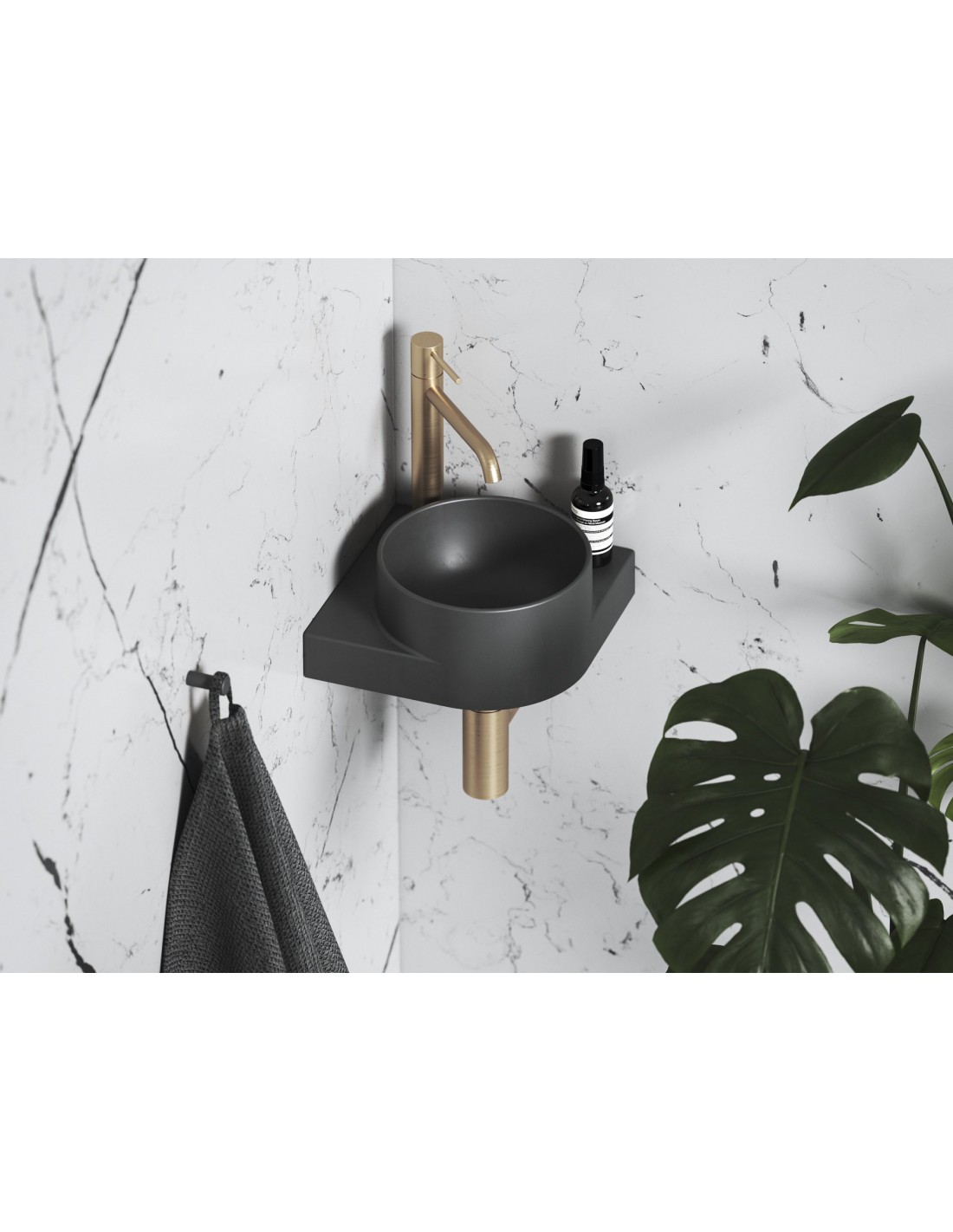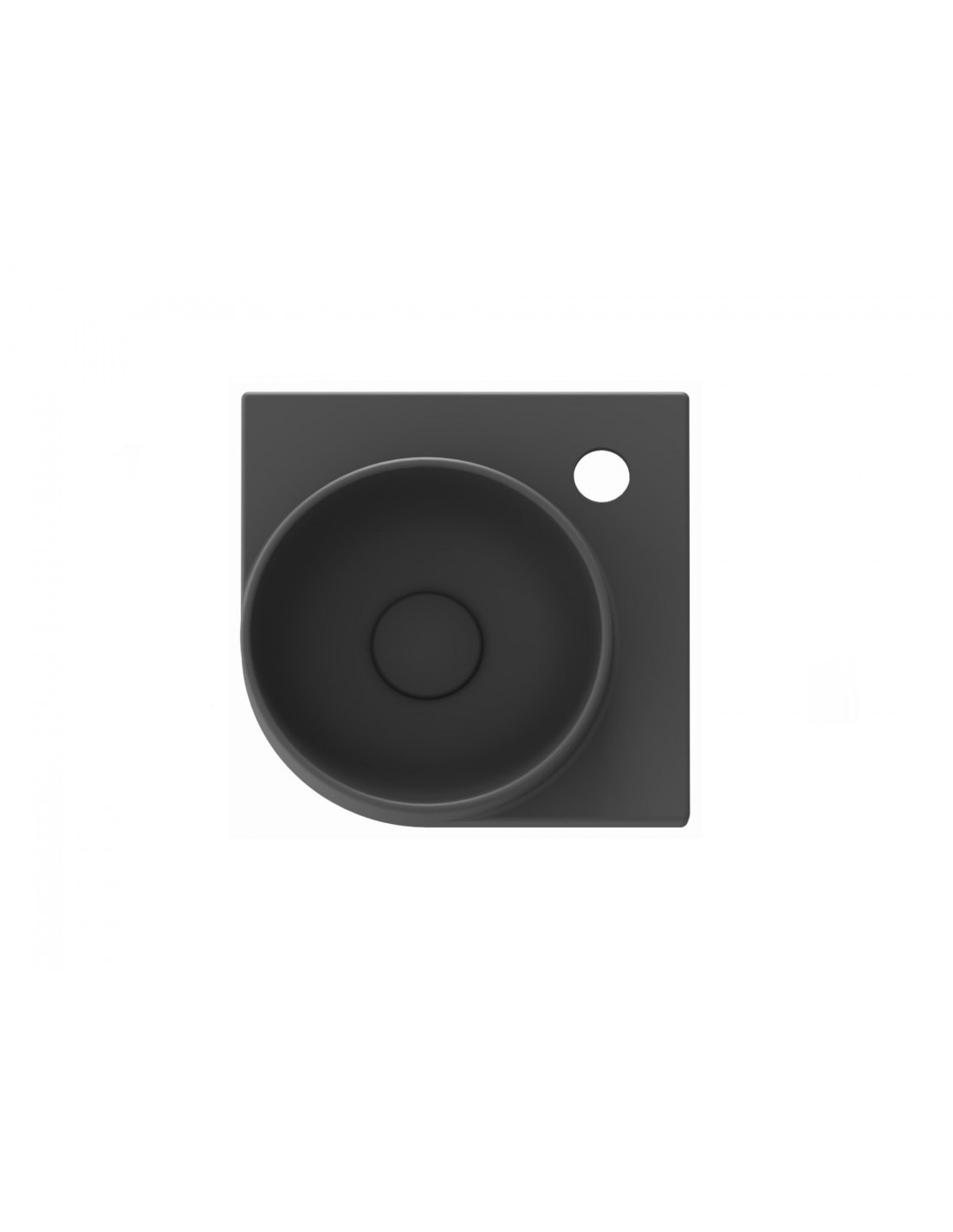 Keraminis kampinis praustuvas Yard, skirtas montuoti su Yard laikikliu, su skyle maišytuvui, be perpildymo angos. Antracitas spalvos.