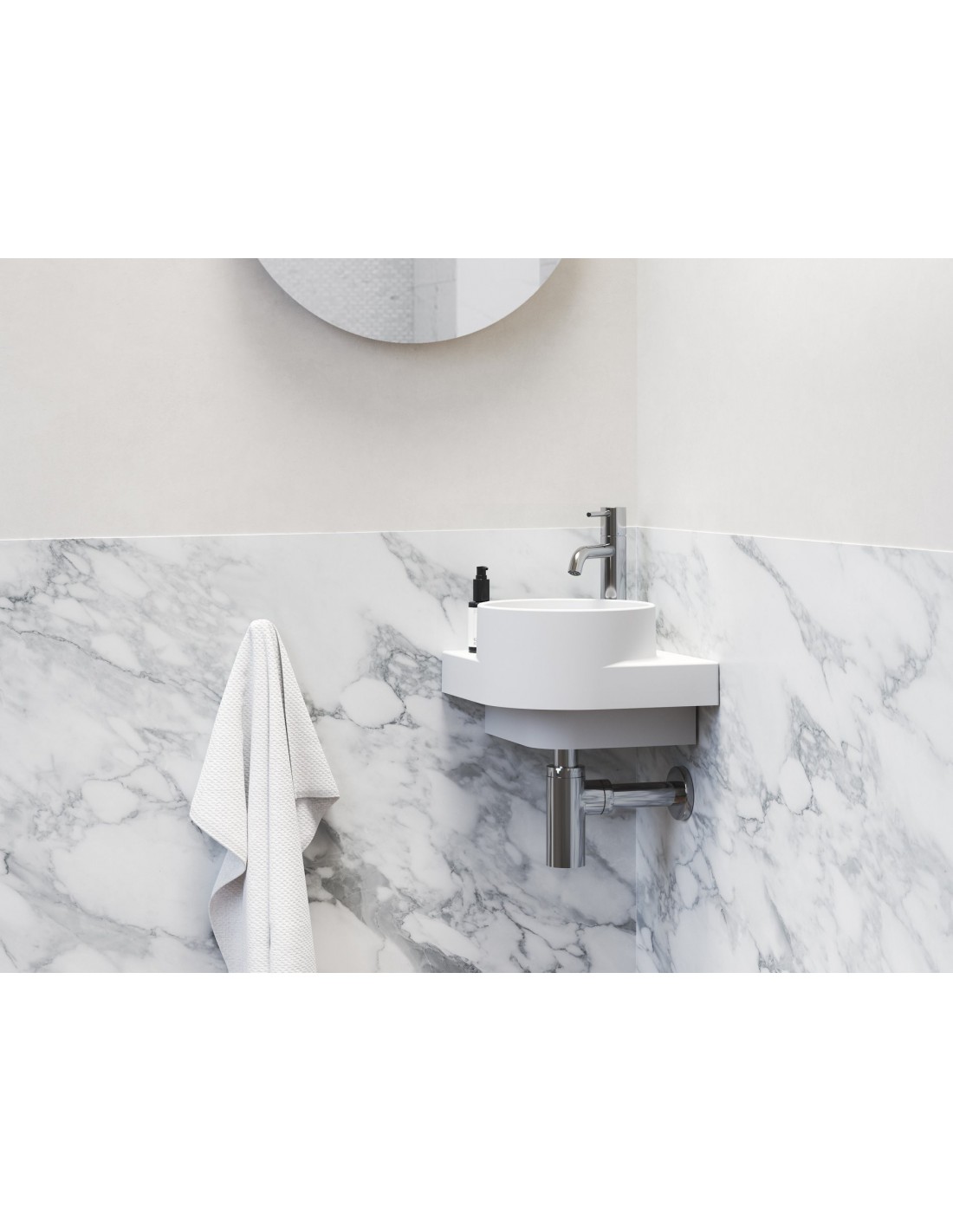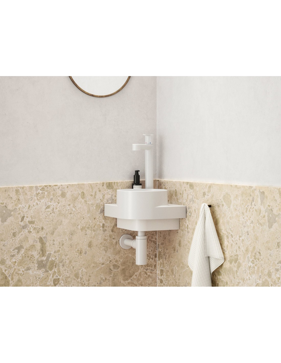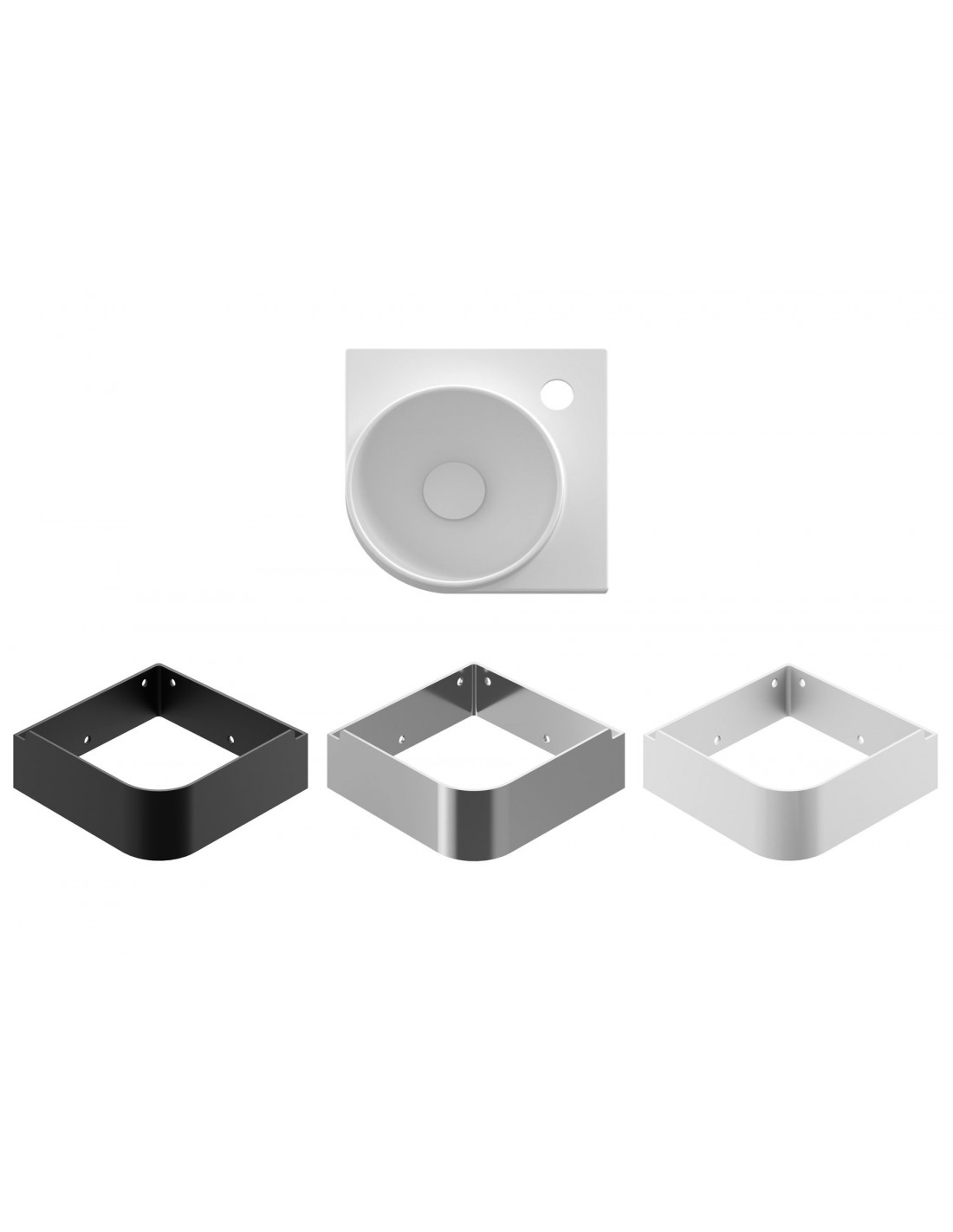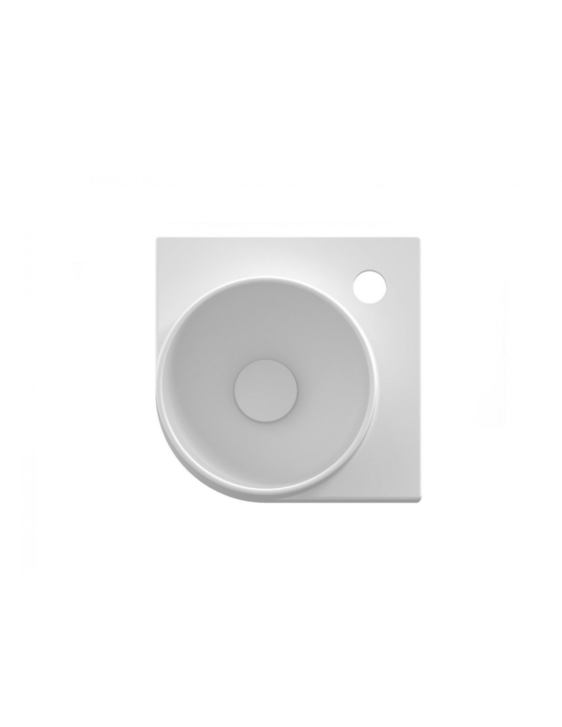 Keraminis kampinis praustuvas Yard, skirtas montuoti su Yard laikikliu, su skyle maišytuvui, be perpildymo angos. Baltos matinės spalvos.