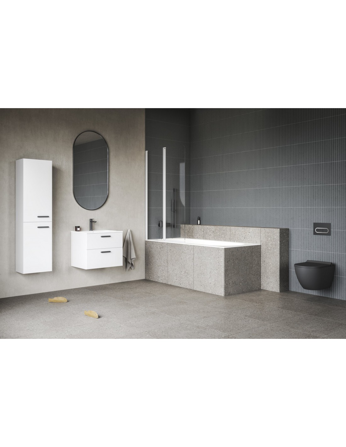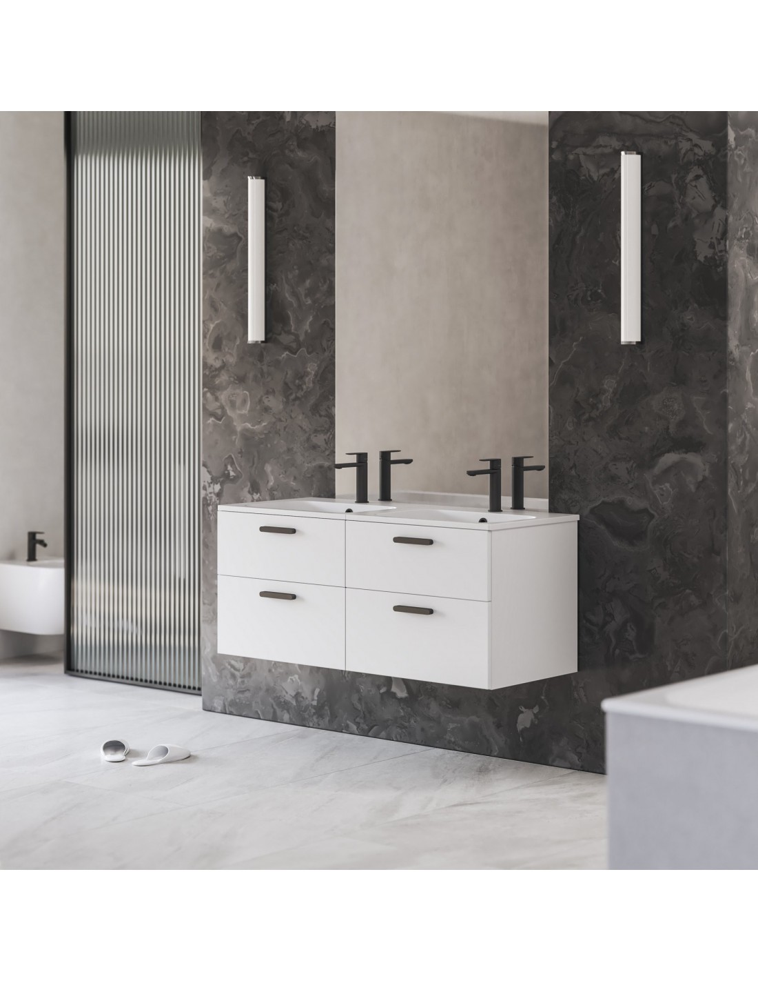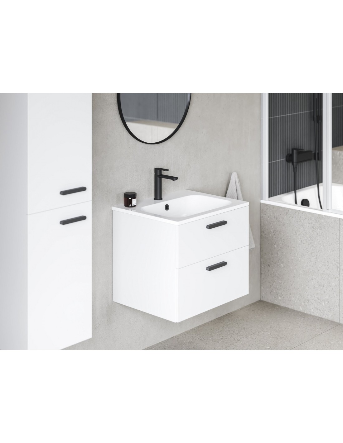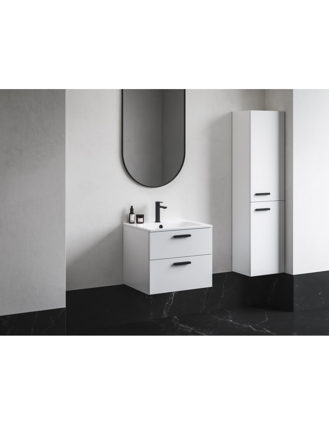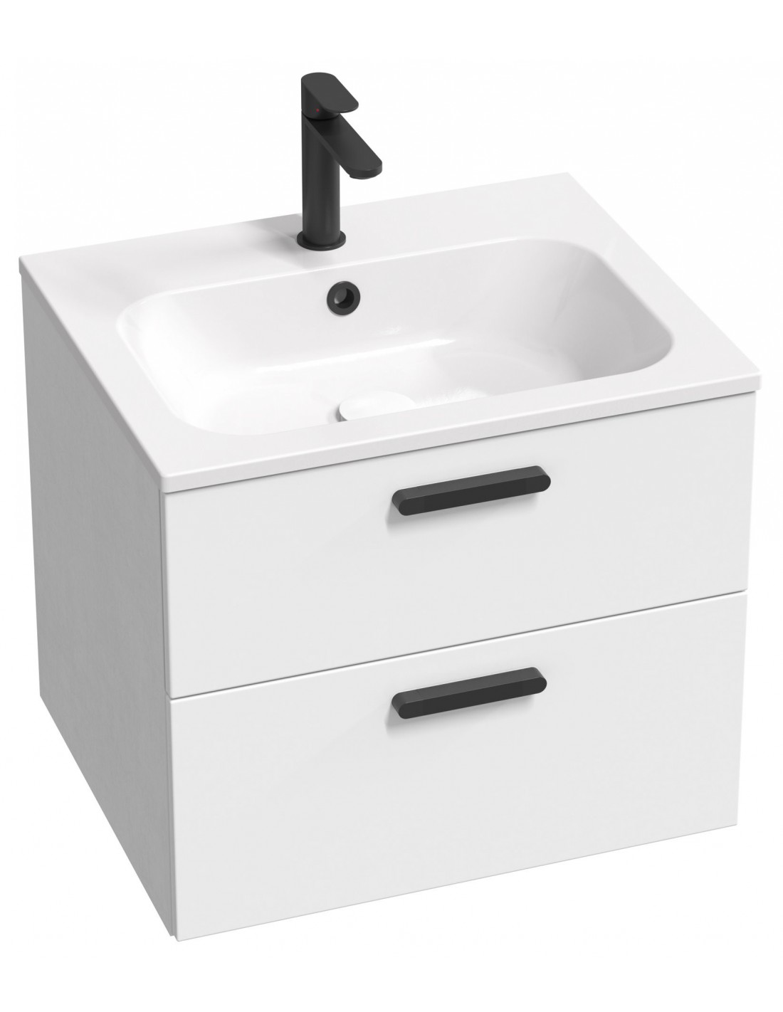 Praustuvo spintelė SD Chrome II su dviem baltos blizgios spalvos stalčiais (lakuota MDF). Korpusas pristatomas surinktas, įskaitant montavimo detales (varžtus, vyrius, kištukus) ir rankenas (chromas, juoda, balta).
