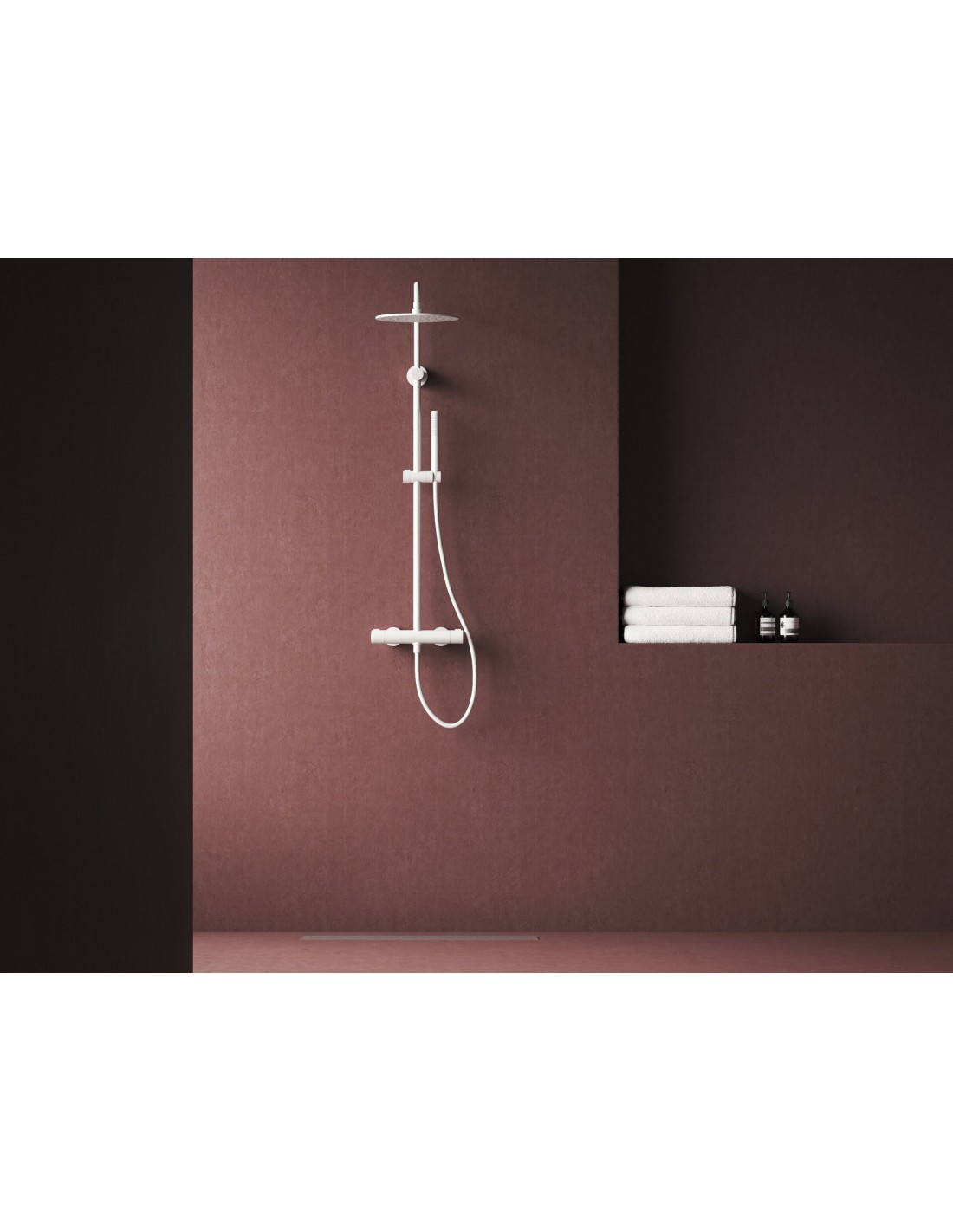 Reguliuojamas, termostatinis dušo stovas Spring, su dušo komplektu. Baltos matinės apdailos.