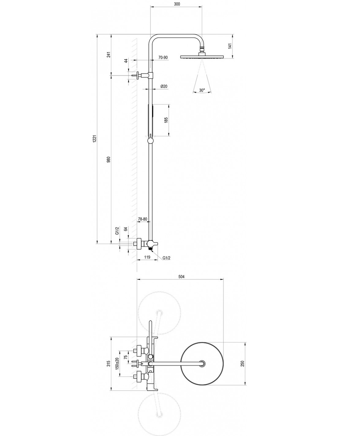 • Viršutinė dušo galva: apvali, 25 cm skersmens, sukiojama į šonus