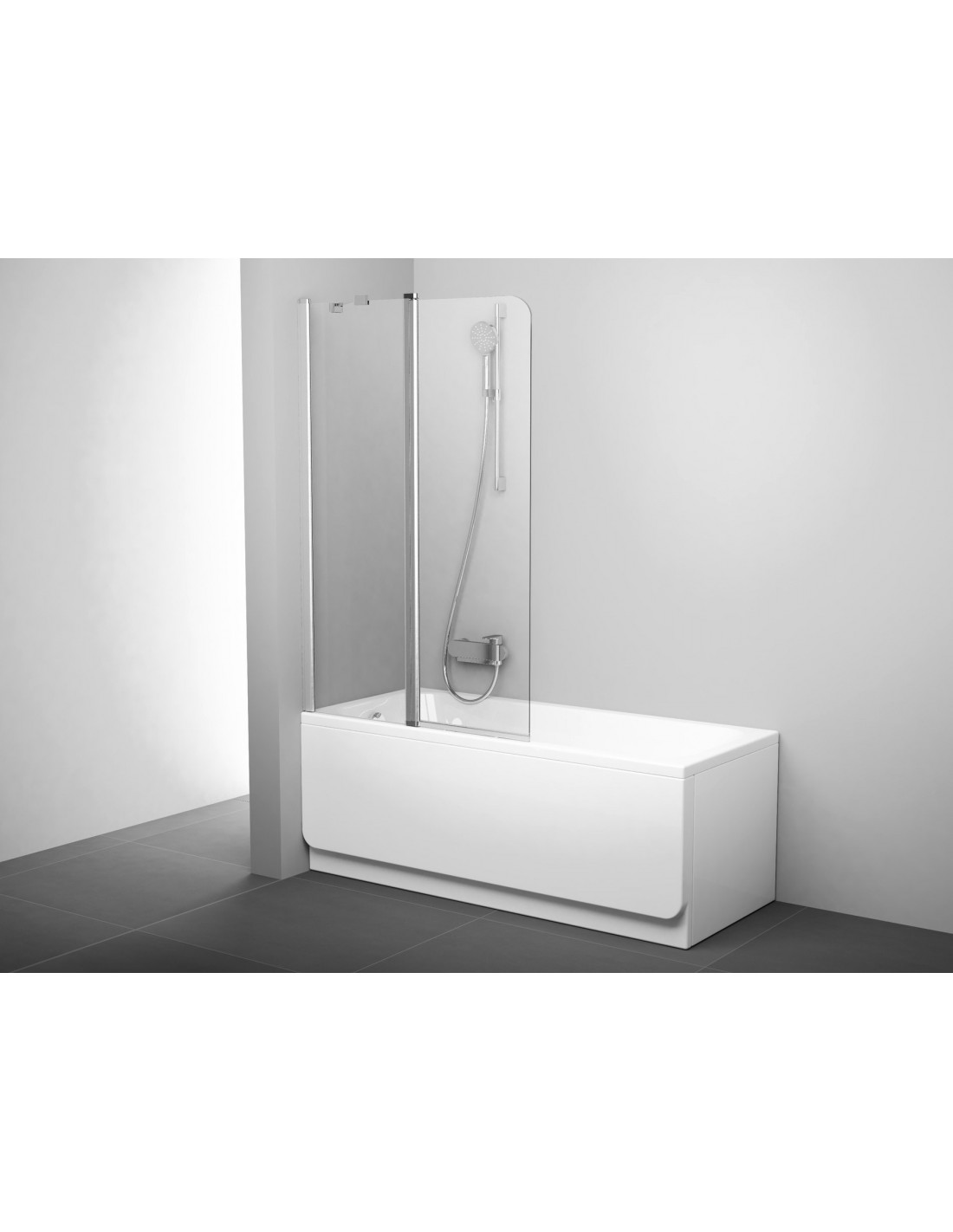 Dviguba judanti vonios sienelė stačiakampėms vonioms. Judanti vonios sienelės dalis dėl cilindrinio profilio susilanksto tiek į vonios vidų, tiek į išorę. Satino apdaila ir skaidraus stiklo užpildas su Ravak AntiCalc® apsauginiu sluoksniu. Dešininis variantas.
